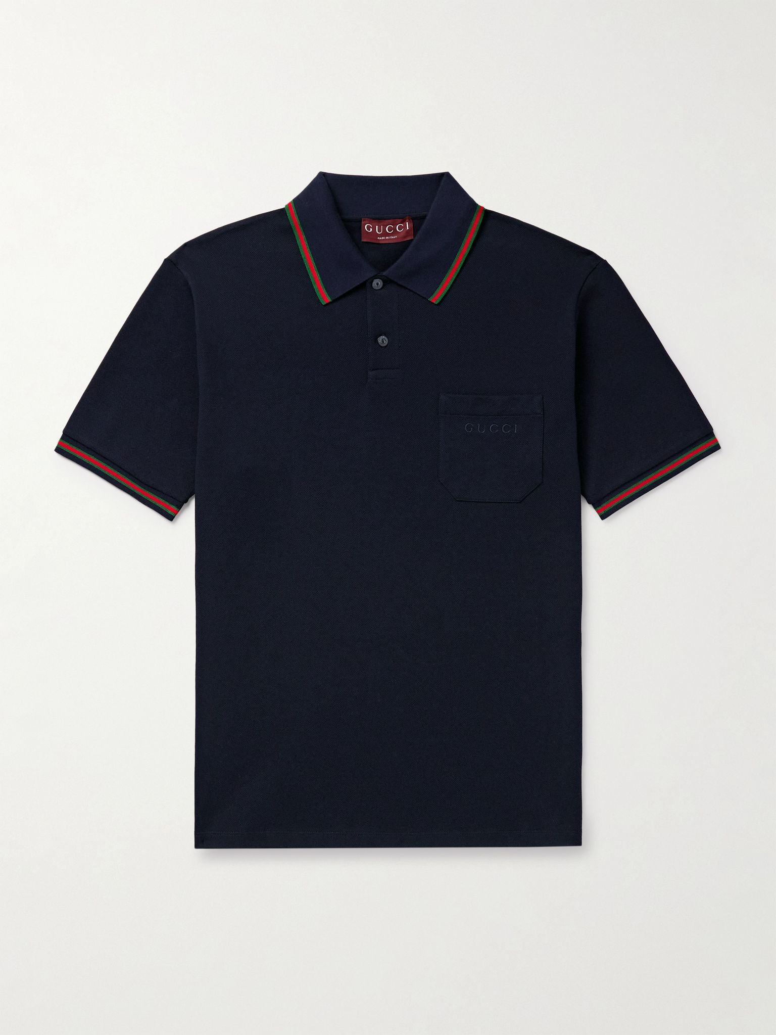 Gucci's polo shirt is designed with subtle details, like an embroidered moniker on the chest pocket and webbing-inspired stripes. It's cut from breathable cotton-pique and fastens with lustrous mother-of-pearl buttons. Size & Fit - Fits true to size. Take your normal size - Designed for a regular fit - Mid-weight, stretchy fabric - Model is shown wearing a M - Model measures: chest 38"/ 96cm, height 6'1"/ 185cm Details & Care - Midnight-blue and red cotton-pique - Button fastenings - 100% cotton - Mother-of-pearl: Australia