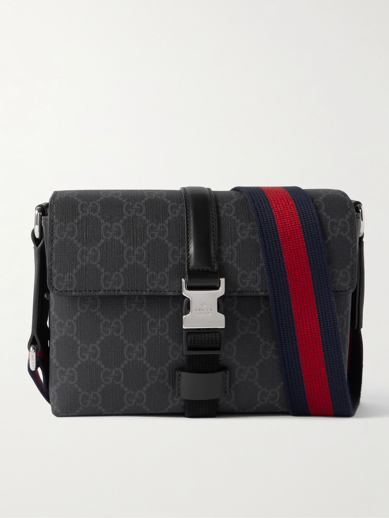 Gucci started out as a luggage designer and pieces like this mini messenger bag are a modern way of honouring its heritage. Crafted in Italy from monogrammed Supreme coated-canvas, it has tonal leather trims, silver-tone hardware and an adjustable webbing strap. Keep your phone, keys and a few cards inside. Details & Care - Black and dark-grey coated-canvas, black leather (Calf) - Adjustable striped webbing shoulder strap - Two internal card slots - Canvas lining - Buckle fastening