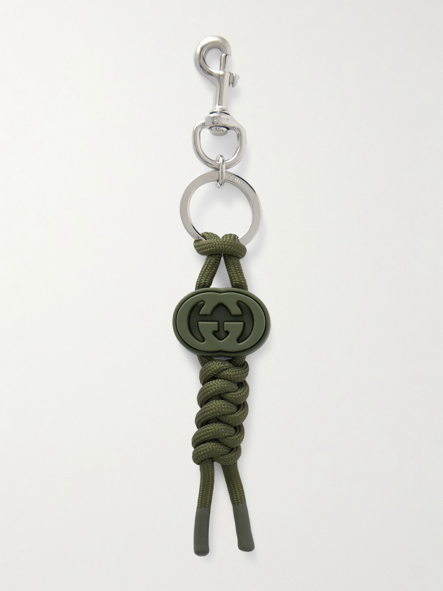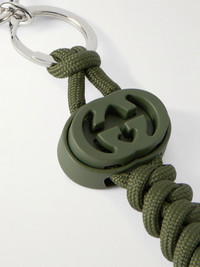 Gucci's fob is made from silver-tone metal and a length of braided rope strung with a leather 'GG' charm. Wear it on your keys or clipped to a bag or your belt loops. Details & Care - Silver-tone metal, green rope and leather - Lobster clasp fastening - Comes with dust bag