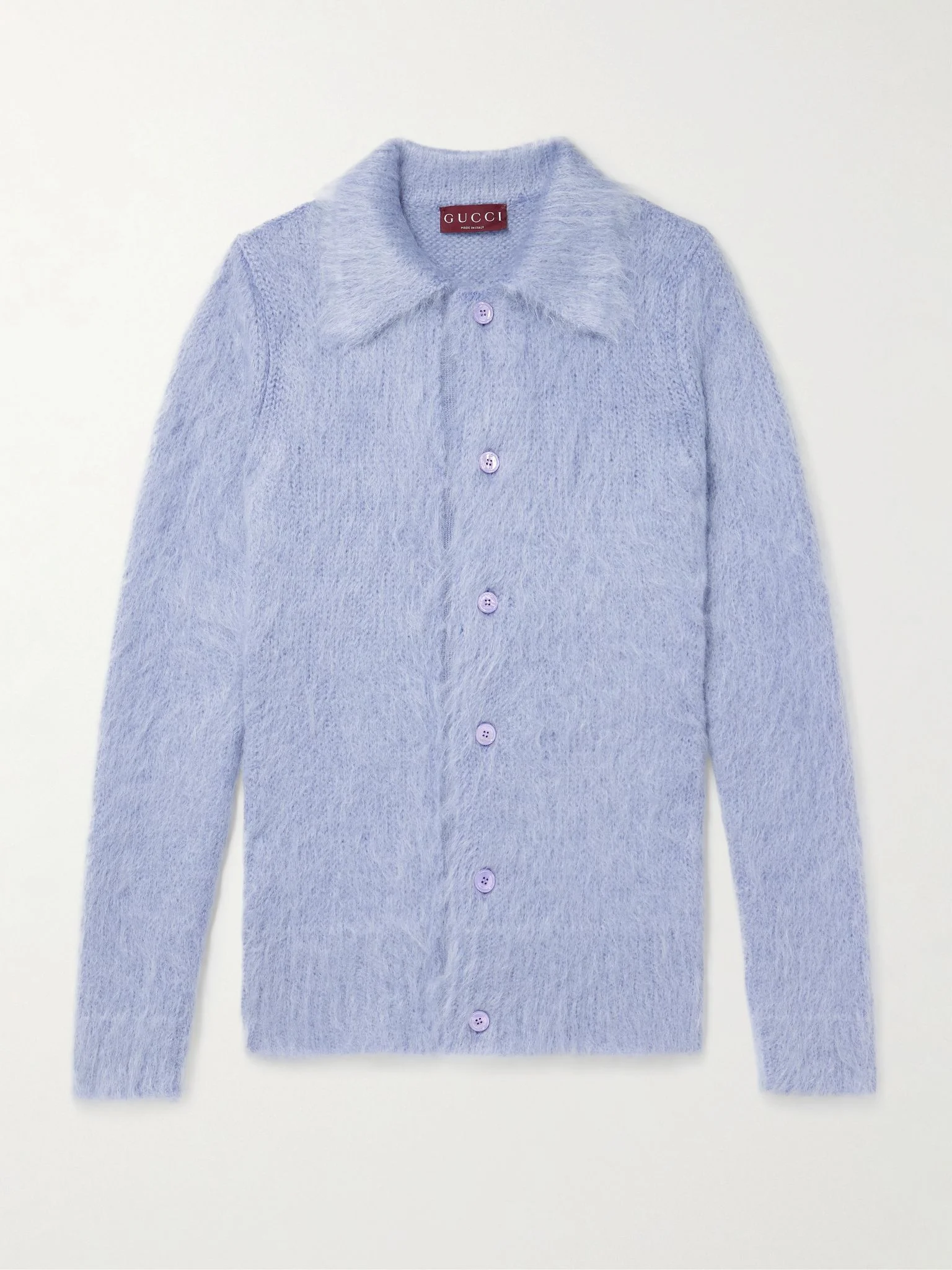 On Gucci's AW25 runway, this cardigan was styled with sharp tailoring in grey shades, letting its texture and colour take the spotlight. It's knitted from soft mohair-blend and brushed to achieve the fuzzy handle. The super wide collar is a reference to '70s styles. Size & Fit - Fits true to size. Take your normal size - Designed for a slim fit - Mid-weight knit - Model is shown wearing a M - Model measures: chest 38"/ 96cm, height 6'3"/ 191cm Details & Care - Lilac brushed mohair-blend - Button fastenings - 67% mohair, 28% nylon, 5% wool - Dry clean - Mother-of-pearl: Australia