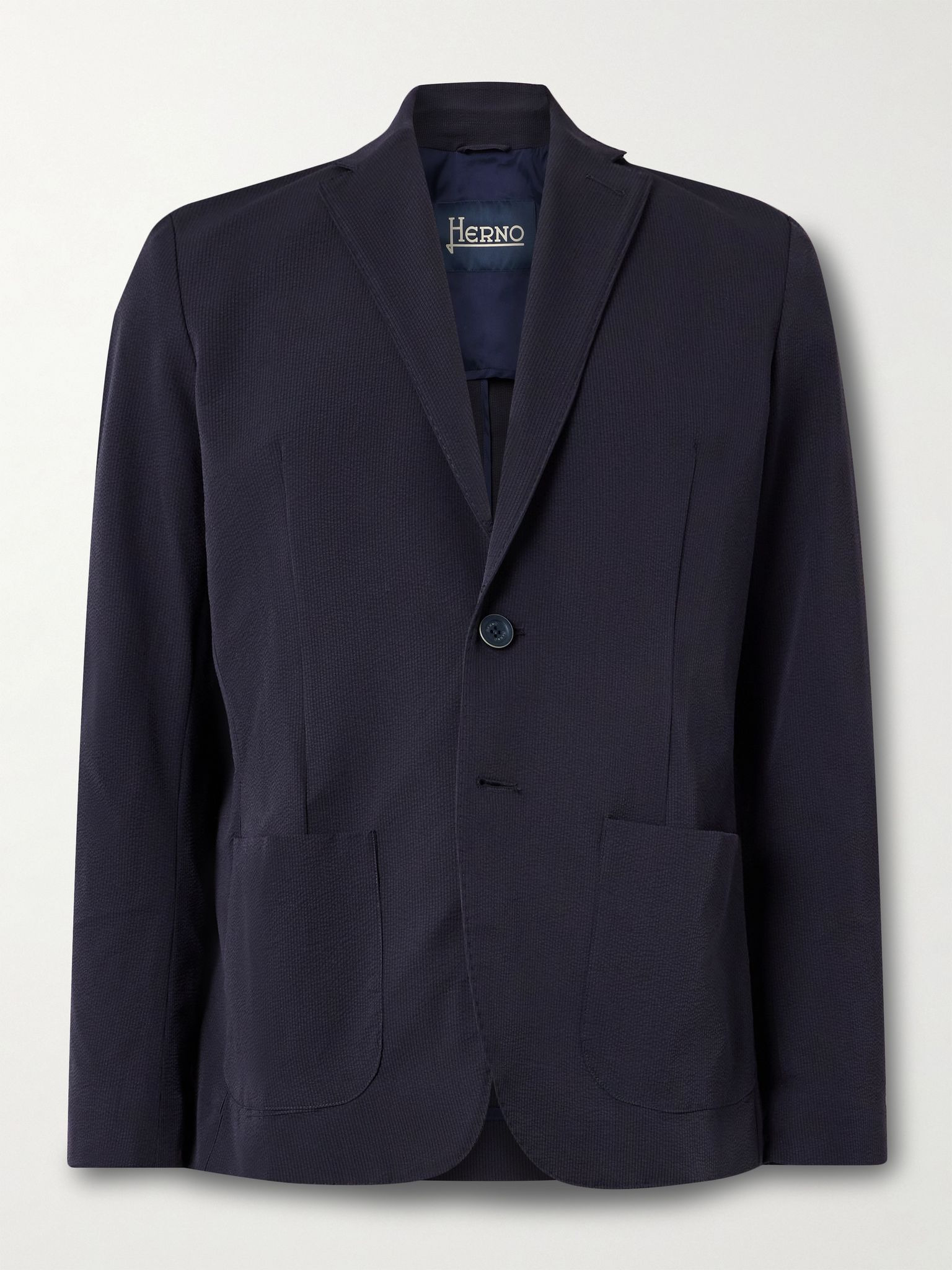 Herno's blazer is ideal for smart-casual dress codes. It's tailored from seersucker with slim lapels and darting through the middle to draw in the waist. Size & Fit - Fits true to size. Take your normal size - Designed for a regular fit - Mid-weight, non-stretchy fabric - Model is shown wearing an IT 48 - Model measures: chest 38"/ 96cm, height 6'0"/ 183cm Details & Care - Navy seersucker - Notch lapels, two front patch pockets, unlined - Two button fastenings - 100% polyester - Dry clean
