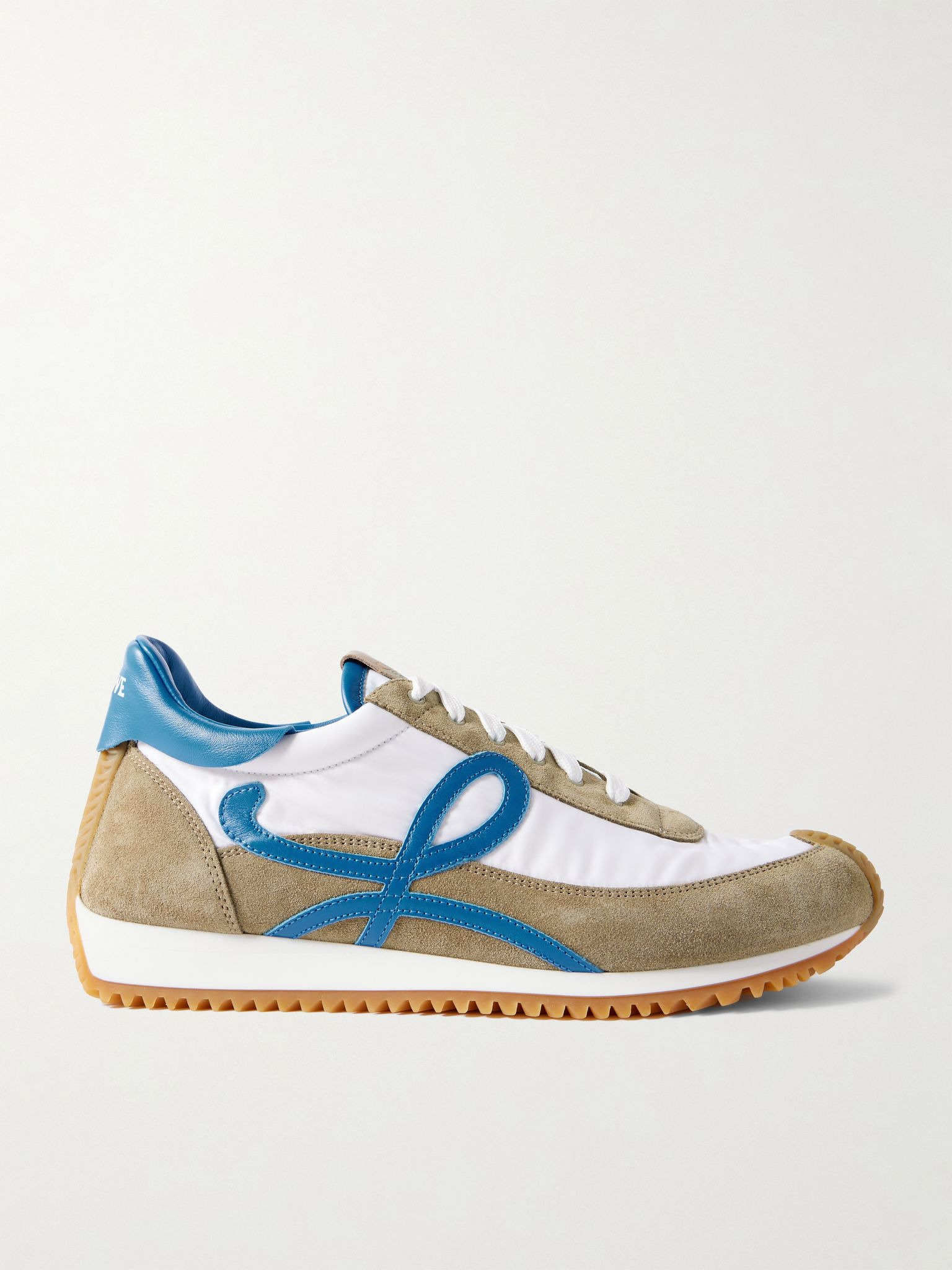 Loewe's '2.0' sneakers are the lighter, more flexible, next generation of its 'Flow Runner' model. Trimmed with leather, this nylon and suede pair has been made in Italy with signature 'L' logos at the sides and serrated soles that extend onto the toes and heels. Size & Fit - Fits true to size. Take your normal size - Only available in full sizes, go up to the nearest whole size if you take a half size - European sizing Details & Care - White nylon, sand suede, blue leather (Calf) - Lace-up - Style number: M816282XBQ