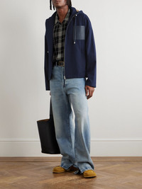 Logo-Debossed Leather-Trimmed Cotton-Twill Hooded Jacket Navy