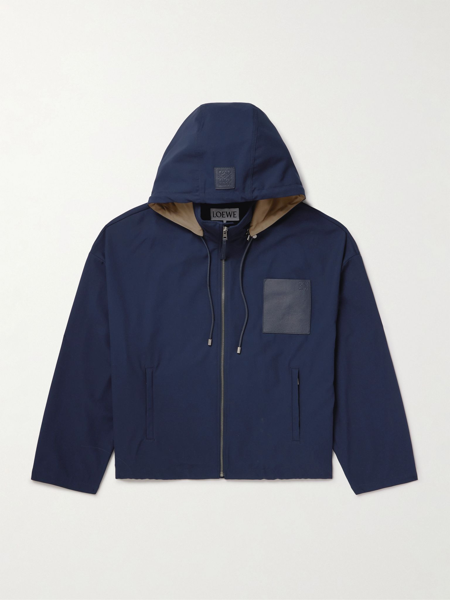 With Loewe's ready-to-wear, there are always details that point to the brand's masterful craftsmanship. This jacket is made from cotton-twill and has a contrast-lined hood, creating a subtle colour-block. The leather chest pocket is debossed with the house's 'Anagram' logo. Size & Fit - Fits true to size. Take your normal size - Designed for a loose fit - Drawcord hem - Mid-weight, non-stretchy fabric - Model is shown wearing an IT 48 - Model measures: chest 38"/ 96cm, height 6'0"/ 183cm Details & Care - Navy cotton-twill and leather (Calf) - Zip fastening - 100% cotton; trim: 100% leather; lining: 100% cotton - Unlined - Dry clean