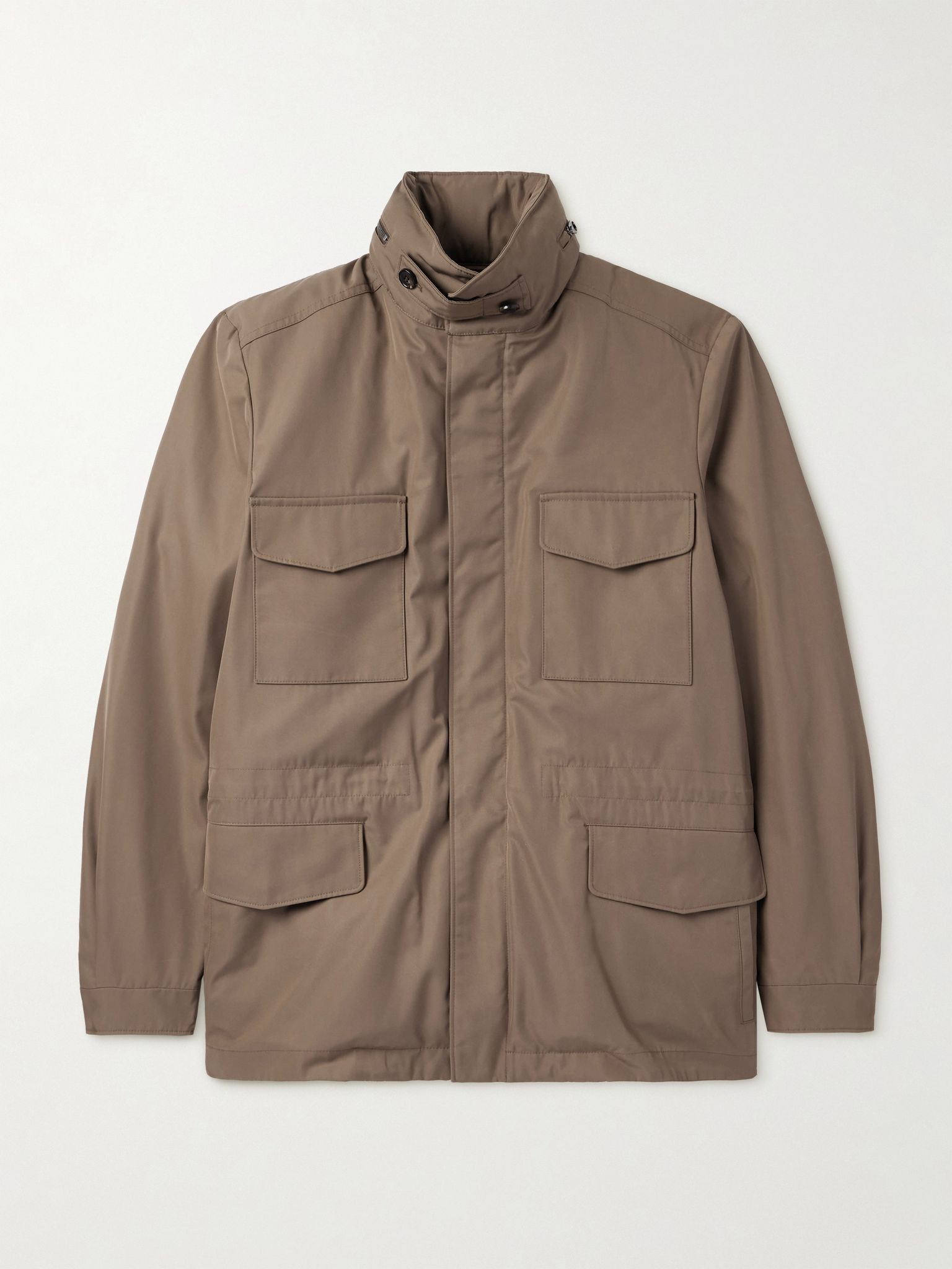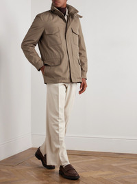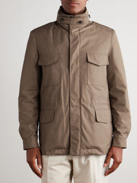 Loro Piana's 'Traveller' jacket is one of the brand's most sought-after styles. This version has been made in Italy from technical shell with pleated cuffs for a full range of movement and generously sized flap pockets. The covered placket gives it a streamlined finish. Size & Fit - Fits true to size. Take your normal size - Designed for a slim fit - Padded, non-stretchy fabric - Model is shown wearing an IT 48 - Model measures: chest 38"/ 96cm, height 6'1"/ 185cm Details & Care - Brown shell - Button, zip and snap fastenings - 100% polyester - Partially lined