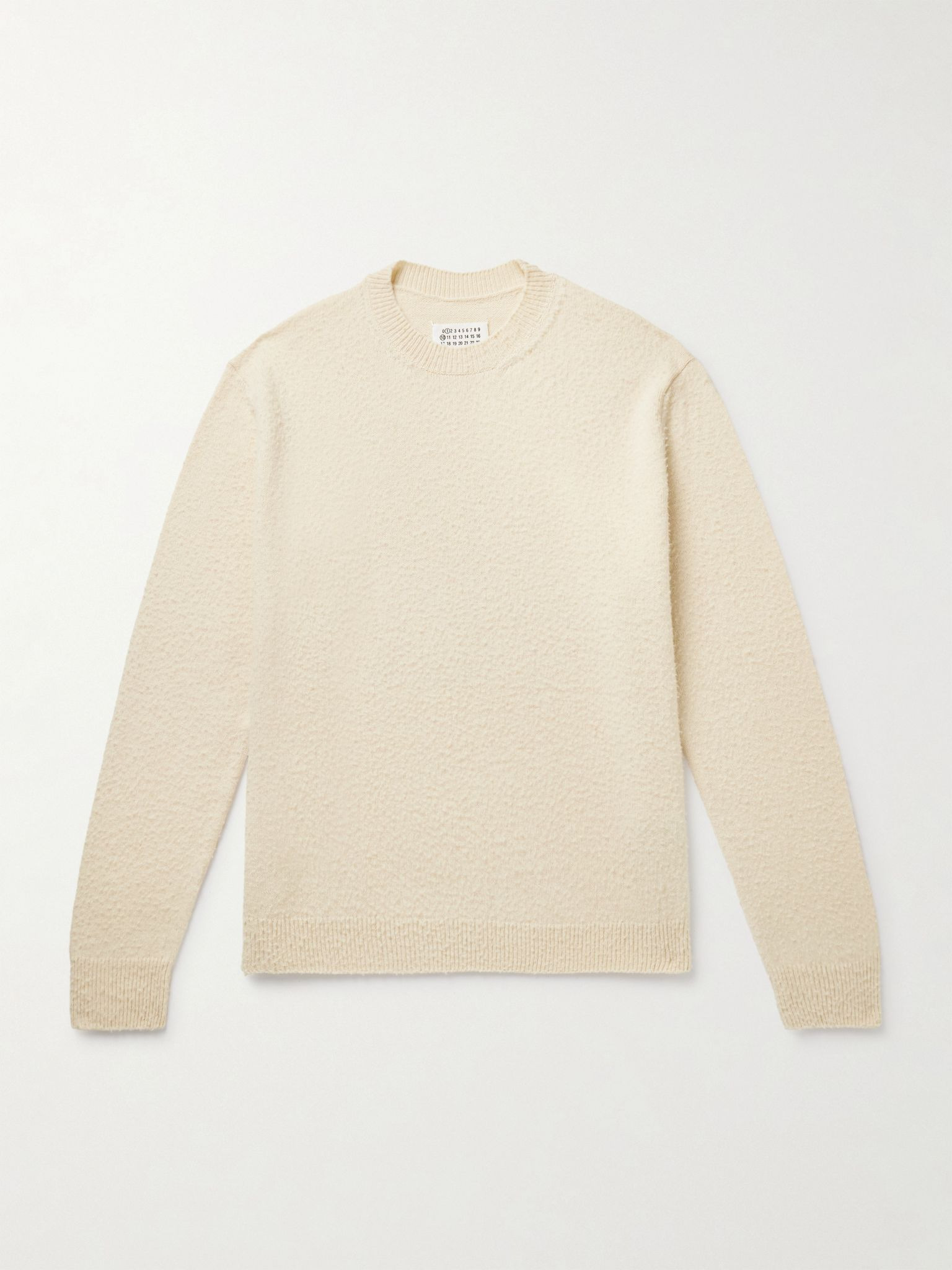 Maison Margiela’s sweater is thoroughly brushed to create the pilled look of a well-worn favourite. Designed for a relaxed fit, it's been knitted in Italy from a seven-gauge wool and cotton-blend and features the signature four stitches at the back. Size & Fit - Model wears a size larger to achieve a looser fit - Mid-weight knit - Model is shown wearing a L - Model measures: chest 38"/ 96cm, height 6'2"/ 188cm Details & Care - Ecru brushed wool and cotton-blend - 55% wool, 45% cotton - Dry clean