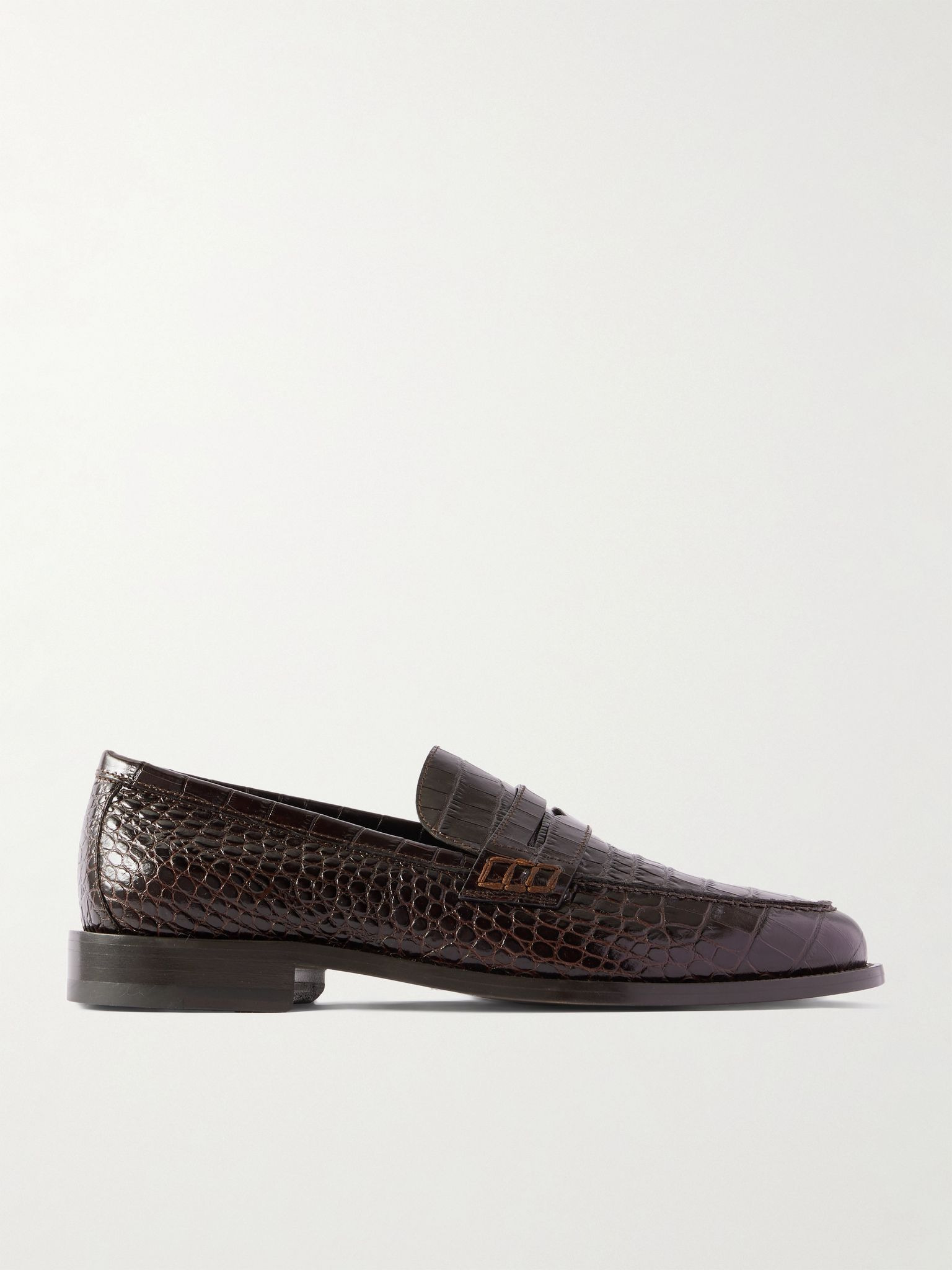 It doesn't get much more classic than Manolo Blahnik's penny loafers. This 'Perry' pair has been handmade in Italy from glossy croc-effect leather. Wear yours with everything from jeans to tailoring. Size & Fit - Fits true to size, take your normal size - UK sizing Details & Care - Dark-brown croc-effect leather (Calf)
