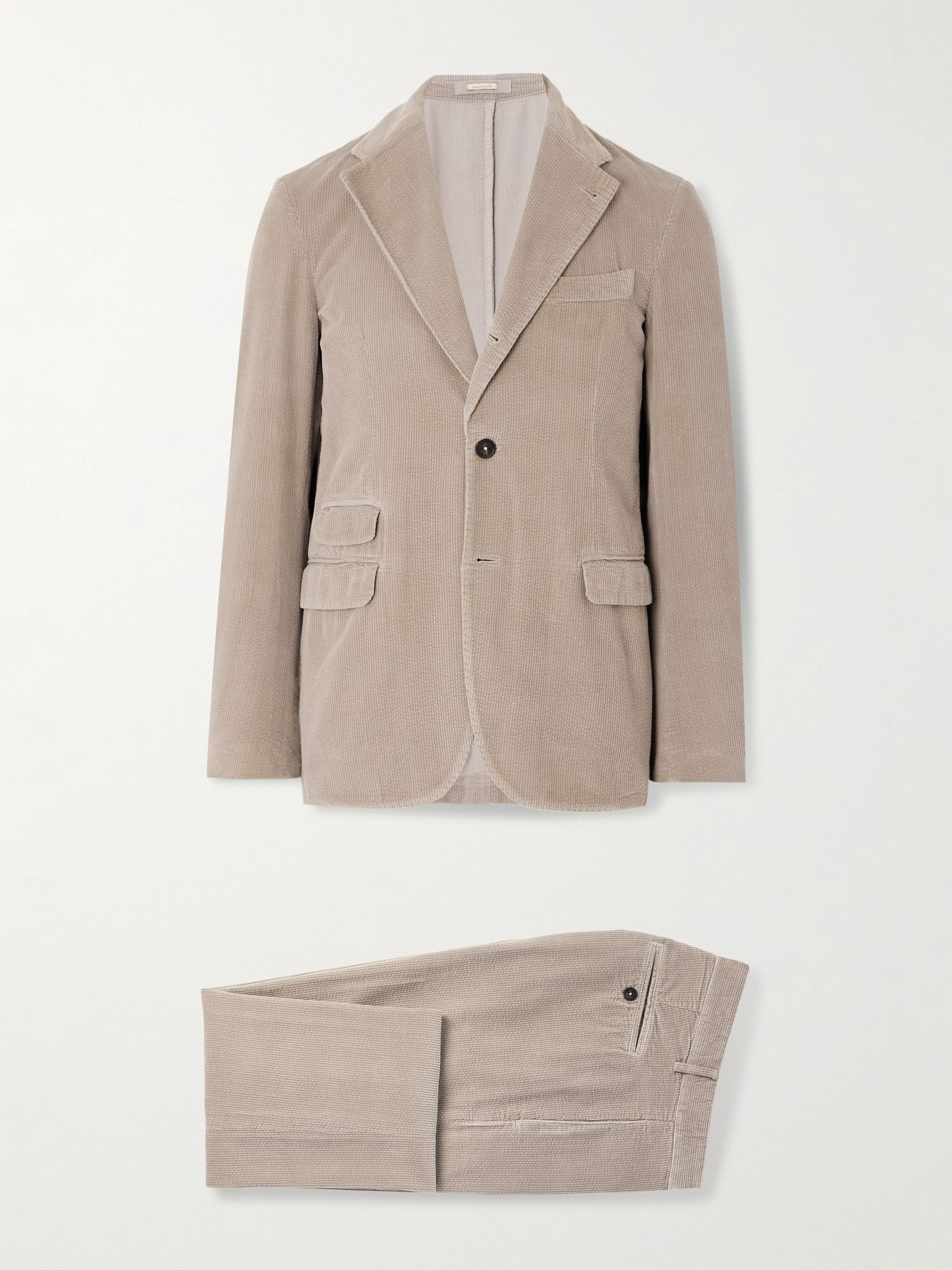 Daniel Craig, as 007, famously wore Massimo Alba's 'Sloop' suit in the 2020 thriller No Time to Die. This sand version has been tailored in Italy from fine-wale cotton-corduroy and works just as well for a comfortable stroll as a car chase around Matera. Size & Fit - Fits true to size. Take your normal size - Those with broad shoulders may wish to take the next size up - Regular cut blazer, tailored for a comfortable fit - Regular-straight leg, mid-rise trousers - Unfinished hems; alter to fit - Mid-weight, non-stretchy fabric - Model is shown wearing an IT 48 - Model measures: chest 38"/ 96cm, waist size 32, height 6'0"/ 183cm Details & Care - Beige cotton-corduroy - Jacket: notch lapels, non-functioning buttoned cuffs, chest welt pocket, three front flap pockets, double vent, unlined - Trousers: belt loops, front slash pockets, back buttoned welt pockets, unfinished hems - Three button-fastening jacket; button and zip fastening-trousers - 100% cotton - Dry clean