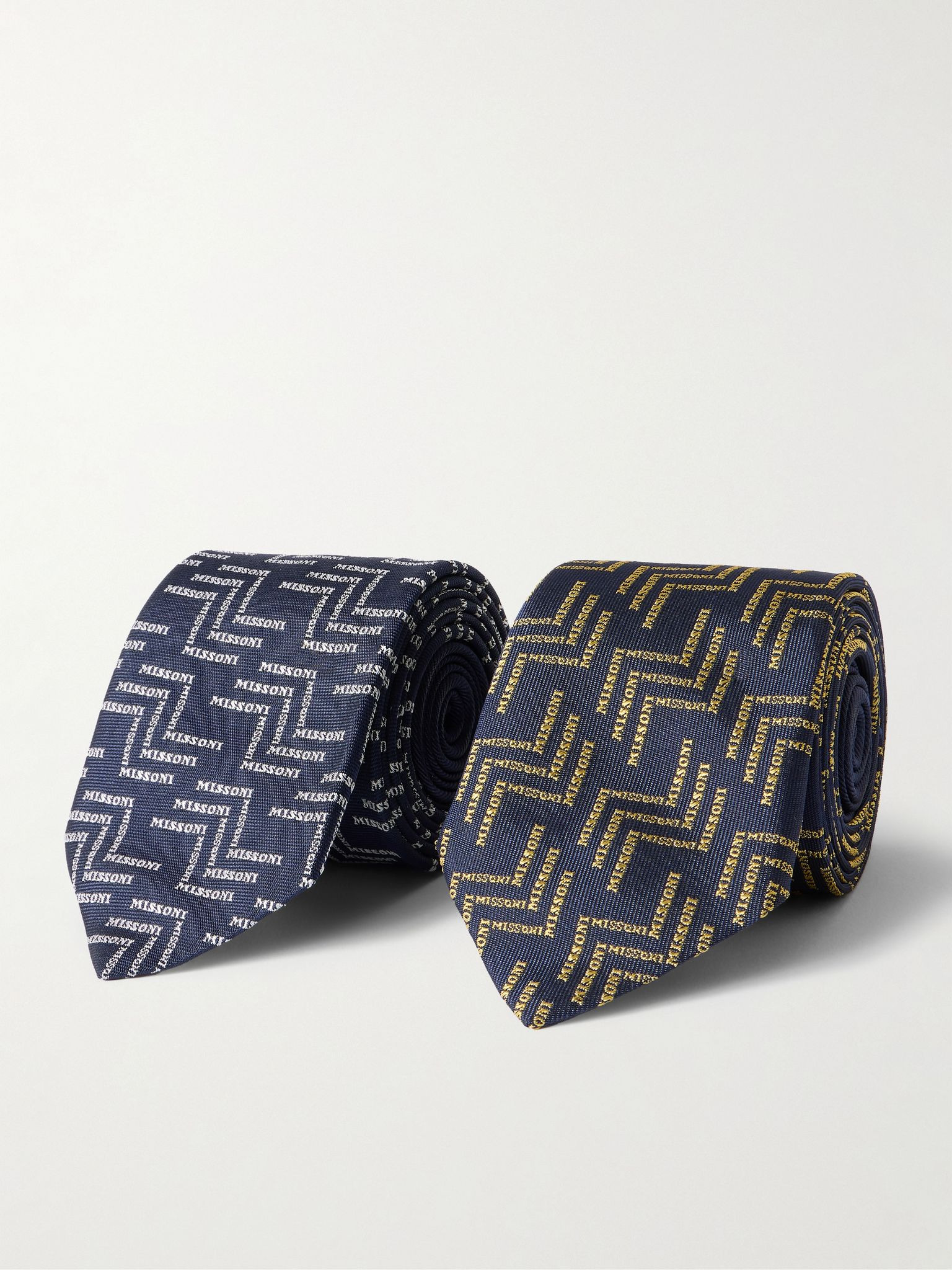 This set of two ties is embroidered with zigzag stripes spelling out 'Missoni'. They've been made in Italy from silk-jacquard and have a 7cm blade. The timeless navy shade means they’ll go with most suiting. Details & Care - Navy silk-jacquard - 100% silk - Dry clean