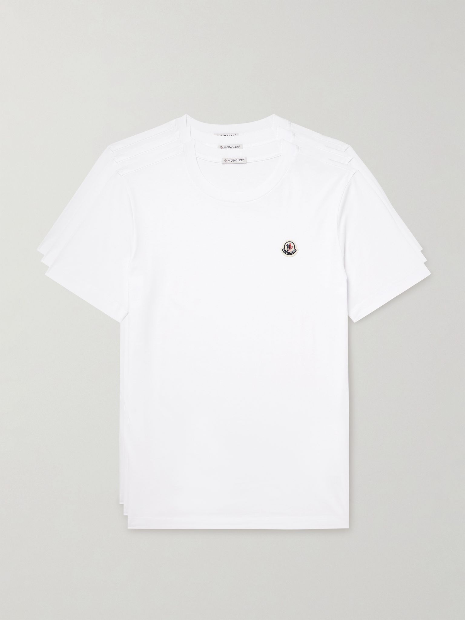 Refresh your T-shirt collection with this set of three from Moncler. Cut from soft cotton-jersey, they're appliqued with the label's felted logo patch and have a regular fit with a classic crew neck. Size & Fit - Fits true to size. Take your normal size - Designed for a regular fit - Mid-weight, slightly stretchy fabric - Model is shown wearing a M - Model measures: chest 38"/ 96cm, height 6'2"/ 188cm Details & Care - White cotton-jersey - 100% cotton - Machine wash