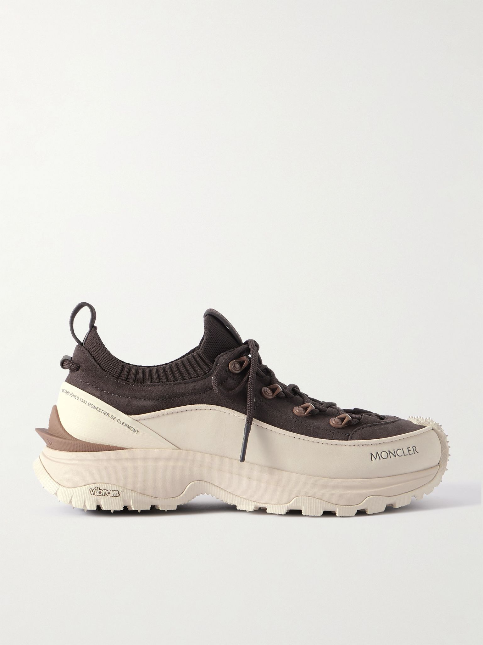 Moncler was founded in Monestier-de-Clermont, a village in the foothills of the French Alps, so it knows how to navigate difficult terrain. Ideal for warm weather, these 'Trailgrip Lite 3' sneakers have nubuck and brushed-suede uppers, aggressive Vibram MEGAGRIP soles that extend onto the toes and comfortable OrthoLite® insoles. Size & Fit - Fits true to size. Take your normal size - European sizing Details & Care - Dark-brown brushed-suede, cream nubuck (Calf) and rubber - Lace-up - Style number: 4M002-90-M7242