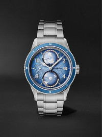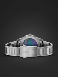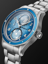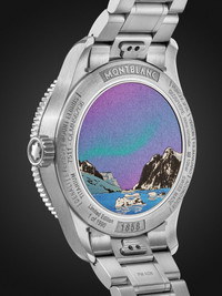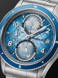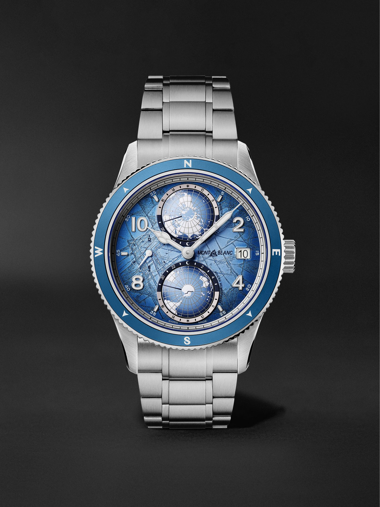 Montblanc's '1858 Geosphere 0 Oxygen' watch has a storied past. It was worn by world-record holding mountaineer Nimsdai Purja while scaling Mount Everest, all without supplemental oxygen, hence its namesake. Continuing that legacy, this 'South Pole Exploration' edition has a titanium case and blue glacier dial, representing both the Northern and Southern hemispheres and is complete with world-time complications. One of only 1990 pieces, it's uniquely devoid of oxygen to ensure its mechanical precision over time, however harsh the environment. For warranty information, please refer to details & care Details & Care Movement - Swiss-made calibre MB 29.27 automatic movement with 46-hour power reserve - 33 jewels, 28,800 Vph Functions - Hour and minute hands - Date window - Second time zone (GMT) subdial, 24-hour Northern and Southern hemisphere subdials with AM/PM indicators Dial - Blue glacier dial - Super-LumiNova®-coated hour and minute hands, Arabic numerals and indices Case - Titanium case - Blue ceramic bi-directional rotating bezel - Crown for time and date adjustments and manual winding - Sapphire glass crystal - Patterned case back - Clasp-fastening stainless steel bracelet; additional grey canvas strap Specifications - Case diameter: 42mm; case thickness: 12.8mm; strap width: 22mm - Water resistance: 10 bar - Comes in a presentation box - Reference number: 7612582367544 We offer a two-year warranty for all working parts and manufacturing faults for luxury watches. For more information, contact one of our experts by emailing watches@mrporter.com