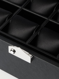 Designed for collectors, Montblanc's watch box is made from cross-grain leather and has a suede-lined interior to protect from scuffs and scratches. It accommodates eight timepieces and will look so sophisticated displayed on your dresser. Details & Care - Black cross-grain leather (Calf) - Eight-piece watch storage - Suede lining - Clasp fastening