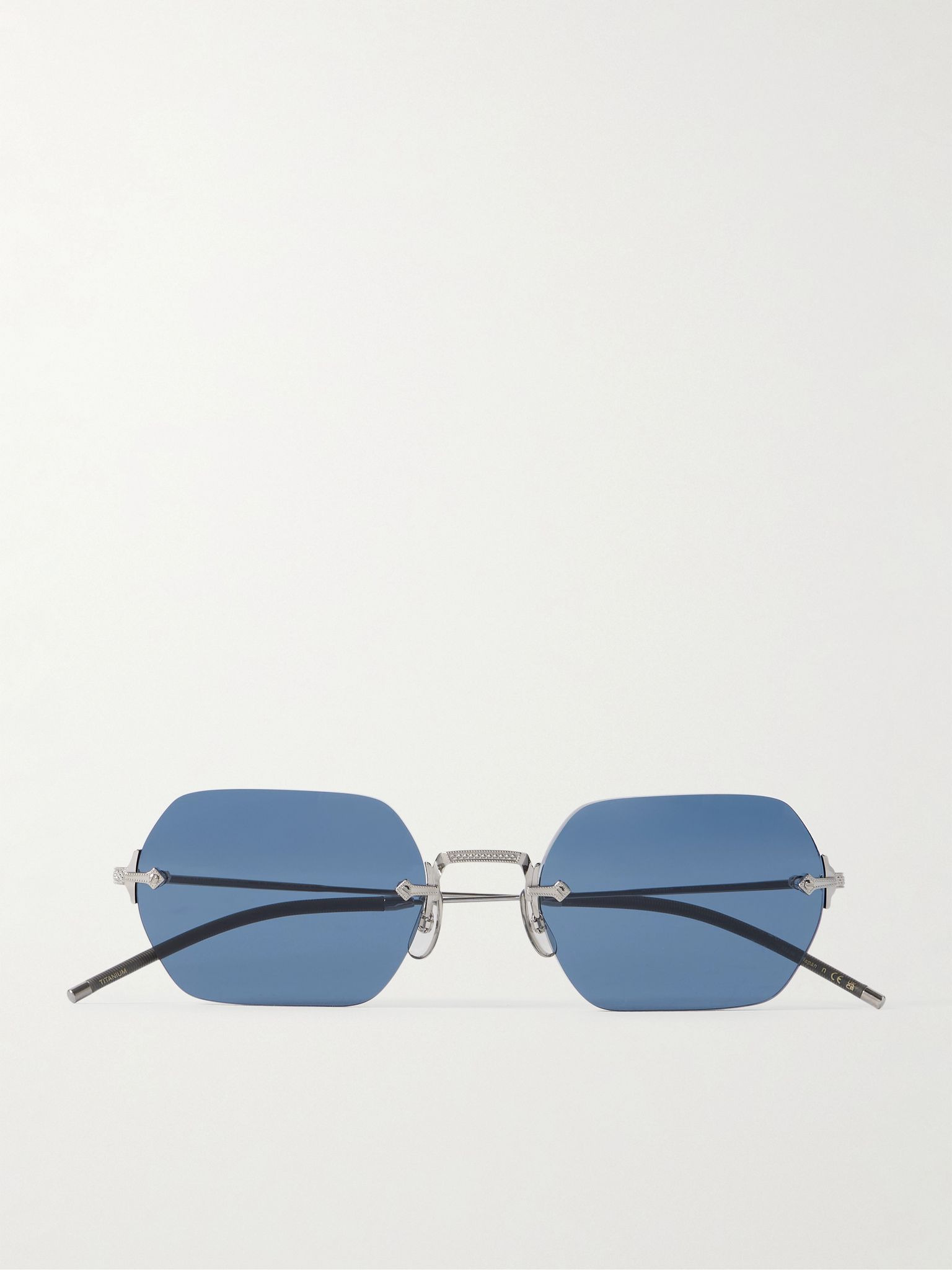 Made in Japan, Oliver Peoples' 'TK-13' sunglasses have a rimless design with angled blue lenses and rest on slim silver-tone arms. The bridge and hinges are intricately detailed with a custom motif. Details & Care - Silver-tone metal - Come with a case - 100% UV protection