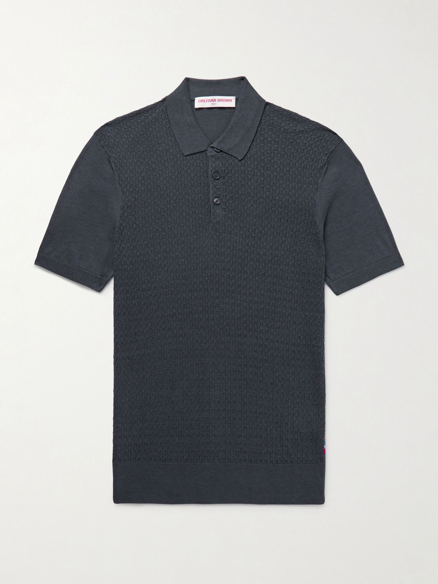 Orlebar Brown's 'Burnham' polo shirt is knitted with a textured lattice pattern, so it's a bit more elevated than your everyday rib. It's made from a soft silk and cotton-blend in an endlessly versatile 'Granite' shade. Size & Fit - Fits true to size. Take your normal size - Designed for a slim fit - Lightweight knit - Model is shown wearing a M - Model measures: chest 38"/ 96cm, height 6'1"/ 185cm Details & Care - Grey silk and cotton-blend - Button fastenings - 62% silk, 38% cotton - Hand wash - Designer colour: Granite