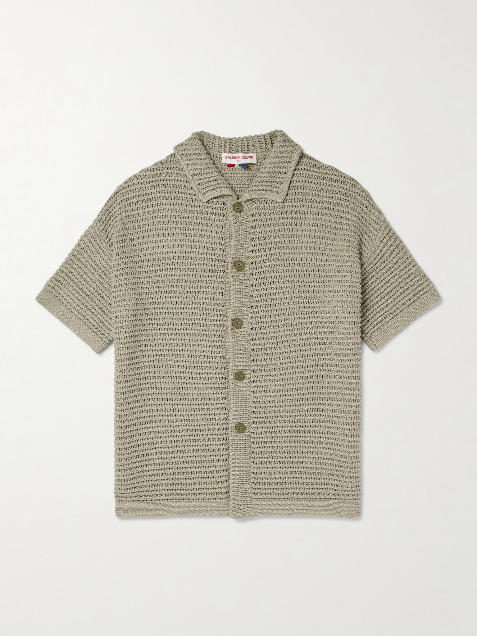 Orlebar Brown's 'Thomas' shirt calls to mind warm, sunny days. It's knitted in chunky, open stitches from cotton and has a relaxed fit emphasised by dropped shoulder seams Size & Fit - Fits true to size. Take your normal size - Designed for a relaxed fit - Dropped shoulder seam - Mid-weight, open knit - Model is shown wearing a M - Model measures: chest 38"/ 96cm, height 6'3"/ 191cm Details & Care - Green organic cotton - Button fastenings - 100% organic cotton - Designer colour: Light Herbal Green