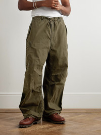 Remi Relief's wide-leg cargo trousers are modelled after vintage military kit. In a dark army-green shade, they've been made in Japan from hard-wearing cotton-canvas and are darted at the knees for a more ergonomic fit. Use the drawstring waistband to adjust the fit. Size & Fit - Fits true to size. Take your normal size - Wide leg, low-crotch style - Drawstring at the waist - Mid-weight, non-stretchy fabric - Model is shown wearing a M - Model measures: waist size 32, height 6'0"/ 183cm Details & Care - Dark army-green cotton-canvas - Snap and zip fastening - 100% cotton - Hand wash