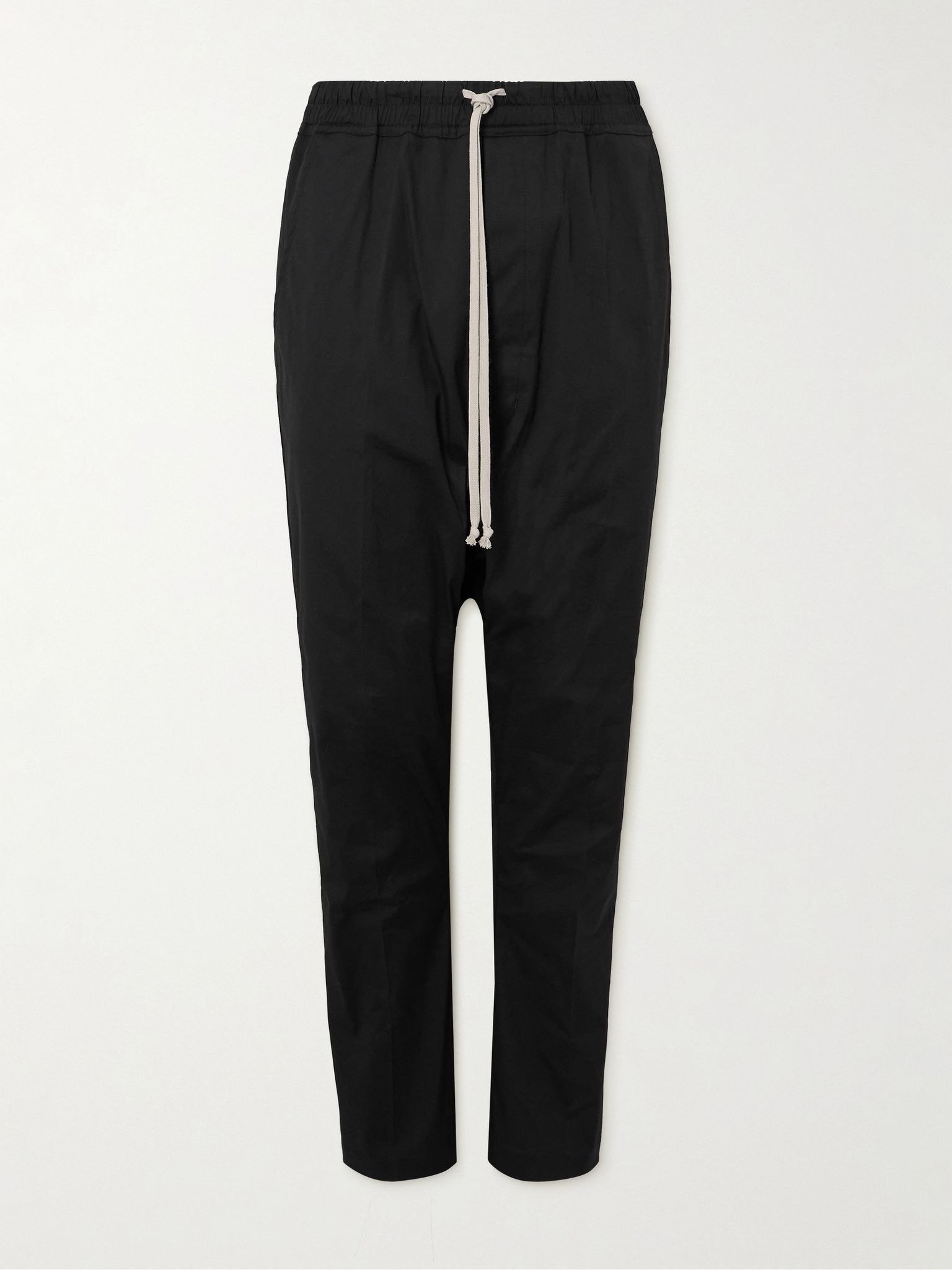 These trousers are Rick Owens' take on traditional tailoring. In a roomy, tapered cut, they've been made in Italy from heavyweight cotton-blend poplin and feature a signature elongated drawstring. Size & Fit - Fits true to size. Take your normal size - Dropped crotch style - Elasticated at the waist - Mid-weight, non-stretchy fabric - Model is shown wearing an IT 48 - Model measures: waist size 32, height 6'0"/ 183cm Details & Care - Black cotton-poplin - 97% cotton, 3% elastane - Hand wash