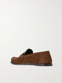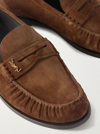 SAINT LAURENT’s penny loafers have been crafted in Italy from plush suede in a rich colour the Maison calls 'Snuff'. They're lightly pinched and gathered around the toes and accented with the emblematic interlocking logo next to the coin slots. Size & Fit - Fits true to size. Take your normal size - European sizing Details & Care - Brown suede (Calf) - Designer colour: Snuff