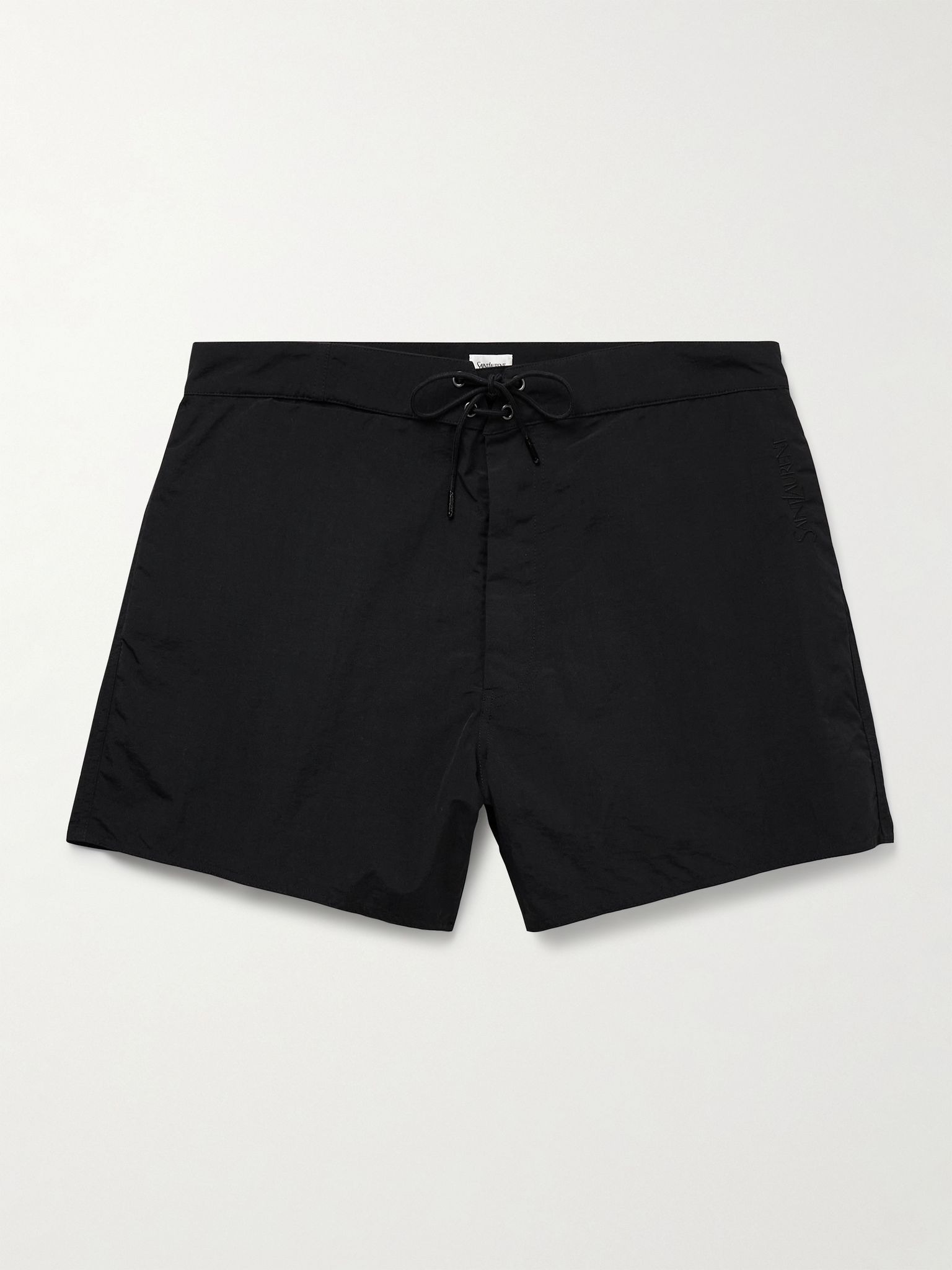 SAINT LAURENT's understated swim shorts will fare just as well for your post-beach plans. Cut from quick-drying shell, they have an adjustable, lace-up drawstring and internal mesh briefs. Size & Fit - Fits small to size. Take one size larger than normal - Slim cut, low-crotch style - Short-length - Built-in mesh briefs - Model is shown wearing a L - Model measures: waist size 32, height 6'1"/ 185cm Details & Care - Black shell - Lace-up - 100% polyamide - Machine wash