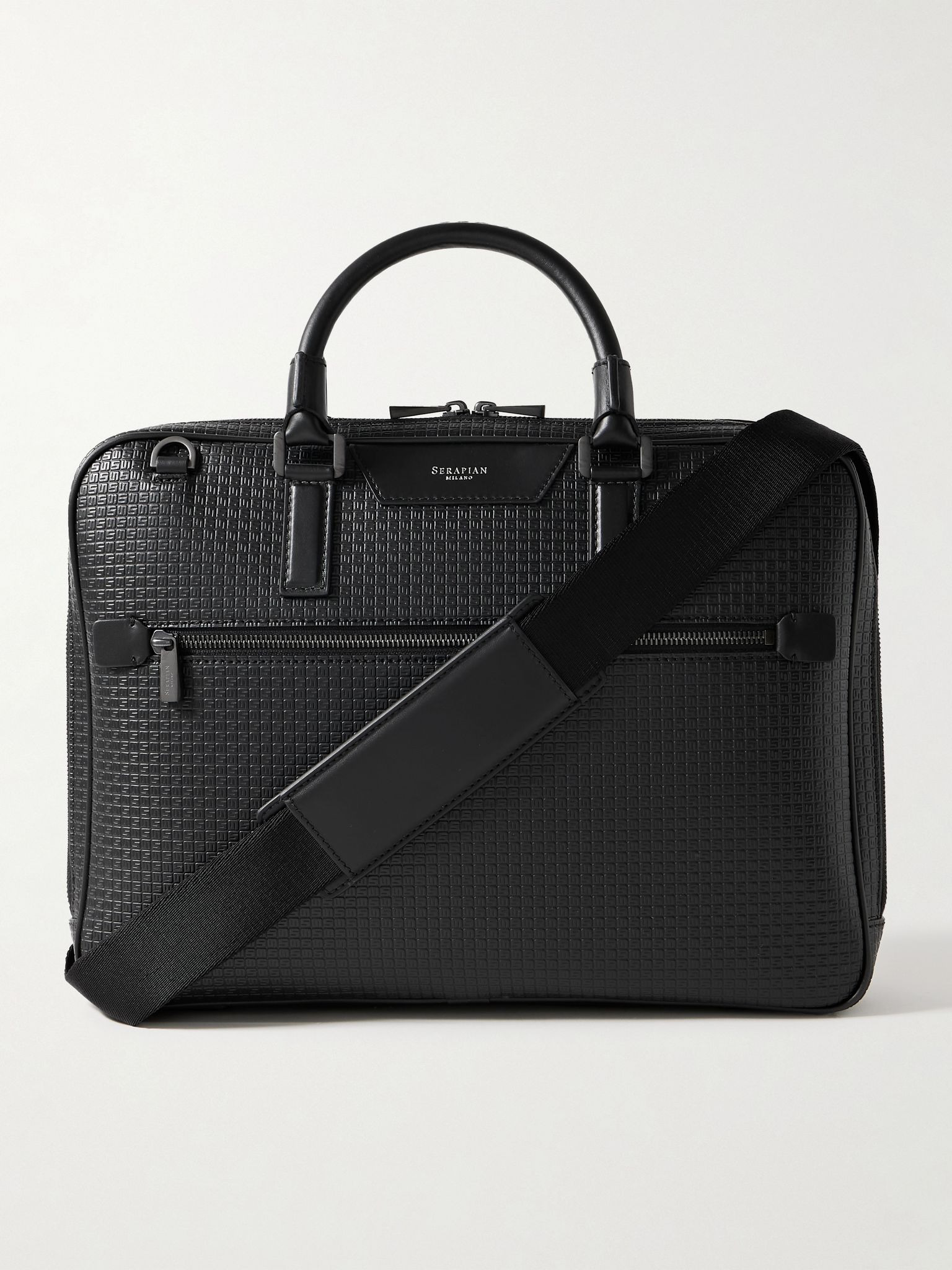 Serapian's Italian-made briefcase is crafted from signature 'Stepan' coated-canvas, which is designed to withstand the wear of day-to-day life. It's reinforced with leather trims and has an adjustable cross-body strap, which can be removed if you prefer to carry it by the top handles. Use the pockets inside to keep your laptop, phone and pens organised. Details & Care - Black Stepan coated-canvas and leather (Calf) - Top handles, detachable adjustable shoulder strap - Front zipped pocket, back trolley sleeve, internal zipped pocket, phone and pen holder, cardholder, padded laptop sleeve, address tag - Fully lined - Two-way zip fastening - Designer colour: Black/ Eclipse Black