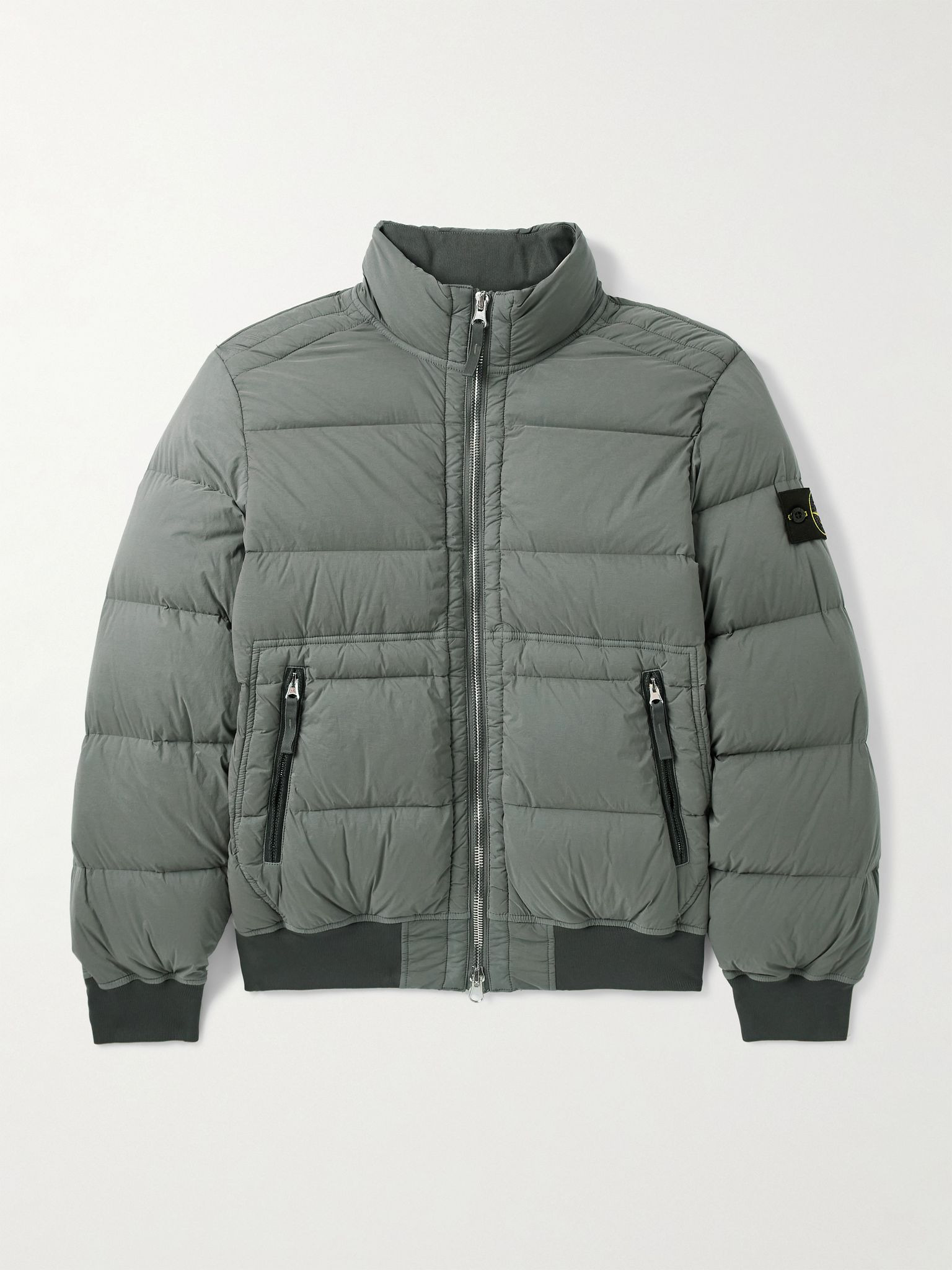 Stone Island's bomber jacket is designed with seamless tunnels to optimise warmth retention. Inspired by military styles, it's made from durable shell and lined along the inside of the funnel neck for comfort. Small to size. See Size & Fit notes. Size & Fit - Fits small to size. Take one size larger than normal - Designed for a regular fit - Ribbed hem - Padded, non-stretchy fabric - Model is shown wearing a L - Model measures: chest 38"/ 96cm, height 6'0"/ 183cm Details & Care - Grey-green shell - Two-way zip fastening - 84% polyamide, 16% elastane; filling: 90% down, 10% feathers (Duck) - Fully lined - Machine wash