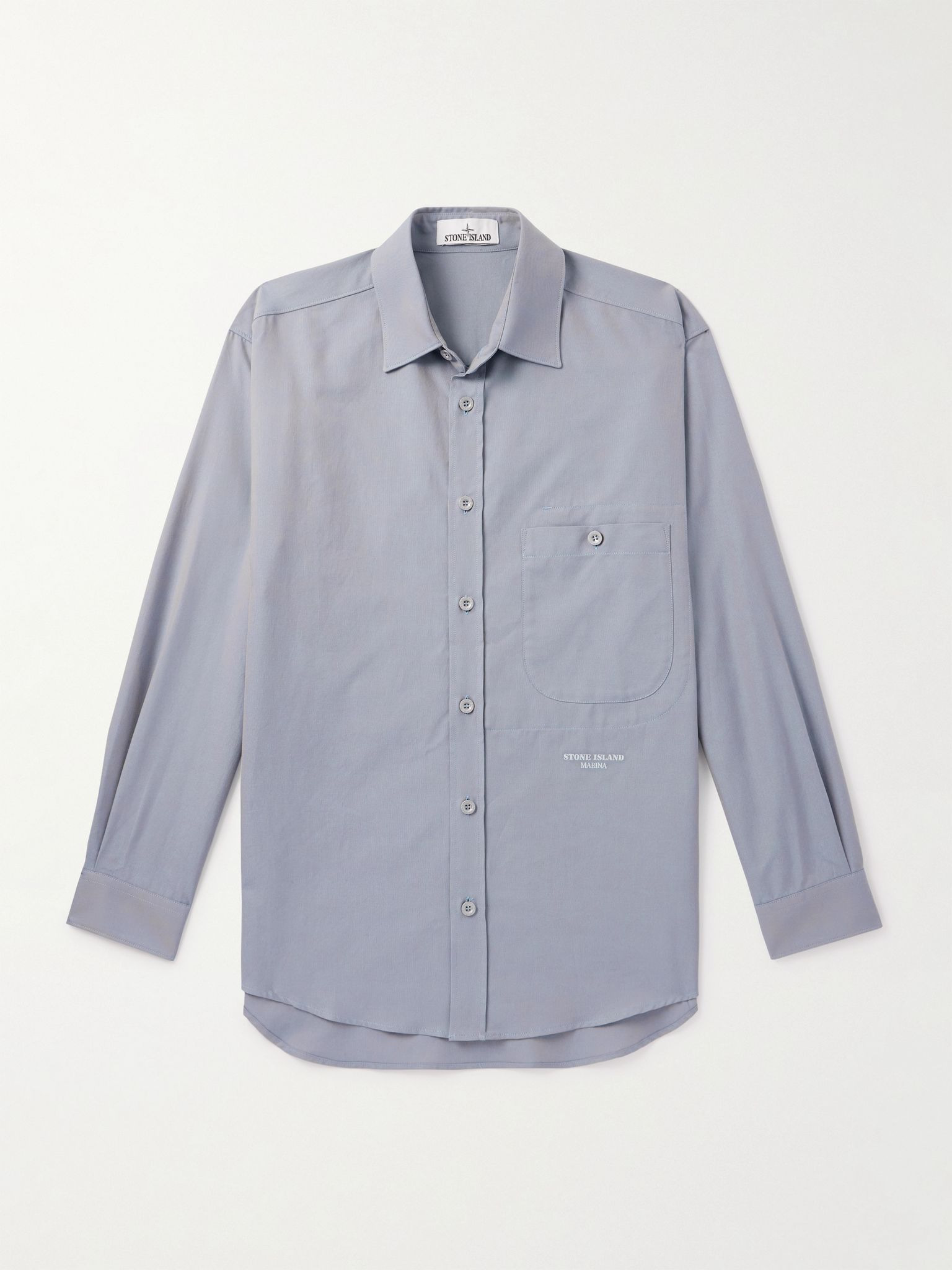 Stone Island owes much of its success to the seas — its custom-designed 'Wind Rose' badge is inspired by nautical navigation. Part of the maritime-inspired 'Marina' collection, this garment-dyed shirt is cut from cotton Oxford and embroidered with a signature logo below the patch pocket. Lower Impact Materials. This product is made using at least 50% lower-impact materials or ingredients. Find out more about our Consciously Crafted criteria here. Size & Fit - Fits true to size. Take your normal size - Those who are above 6'1"/ 185cm may wish to take the next size up - Designed for a slightly loose fit - Lightweight, non-stretchy fabric - Model is shown wearing a M - Model measures: chest 38"/ 96cm, height 6'0"/ 183cm Details & Care - Blue cotton Oxford - Button fastenings - 100% cotton - Machine wash