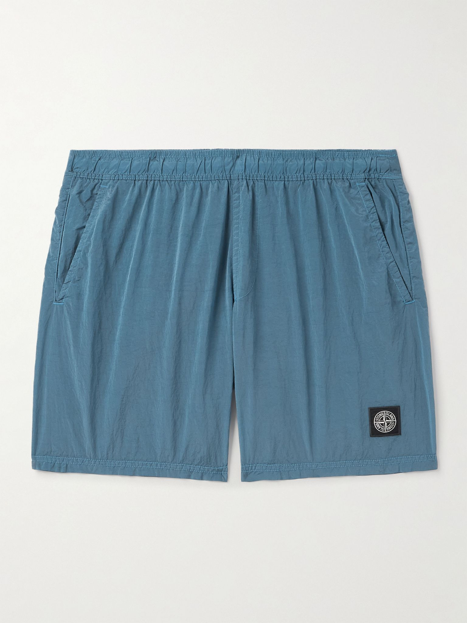 Highlighting Stone Island's fabric innovation, these swim shorts are made from lightweight, quick-drying ECONYL® Nylon Metal (regenerated from fishing nets and fabric scraps) with a unique crinkled texture. They're cut for a relaxed, straight fit and have built-in mesh briefs and a flexible drawstring waistband. Lower Impact Materials. This product is made using at least 50% lower-impact materials or ingredients. Find out more about our Consciously Crafted criteria here. Details & Care - Blue ECONYL® Nylon Metal - 100% nylon - Dry clean