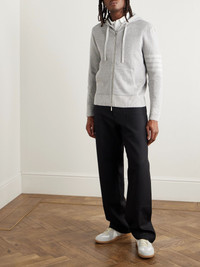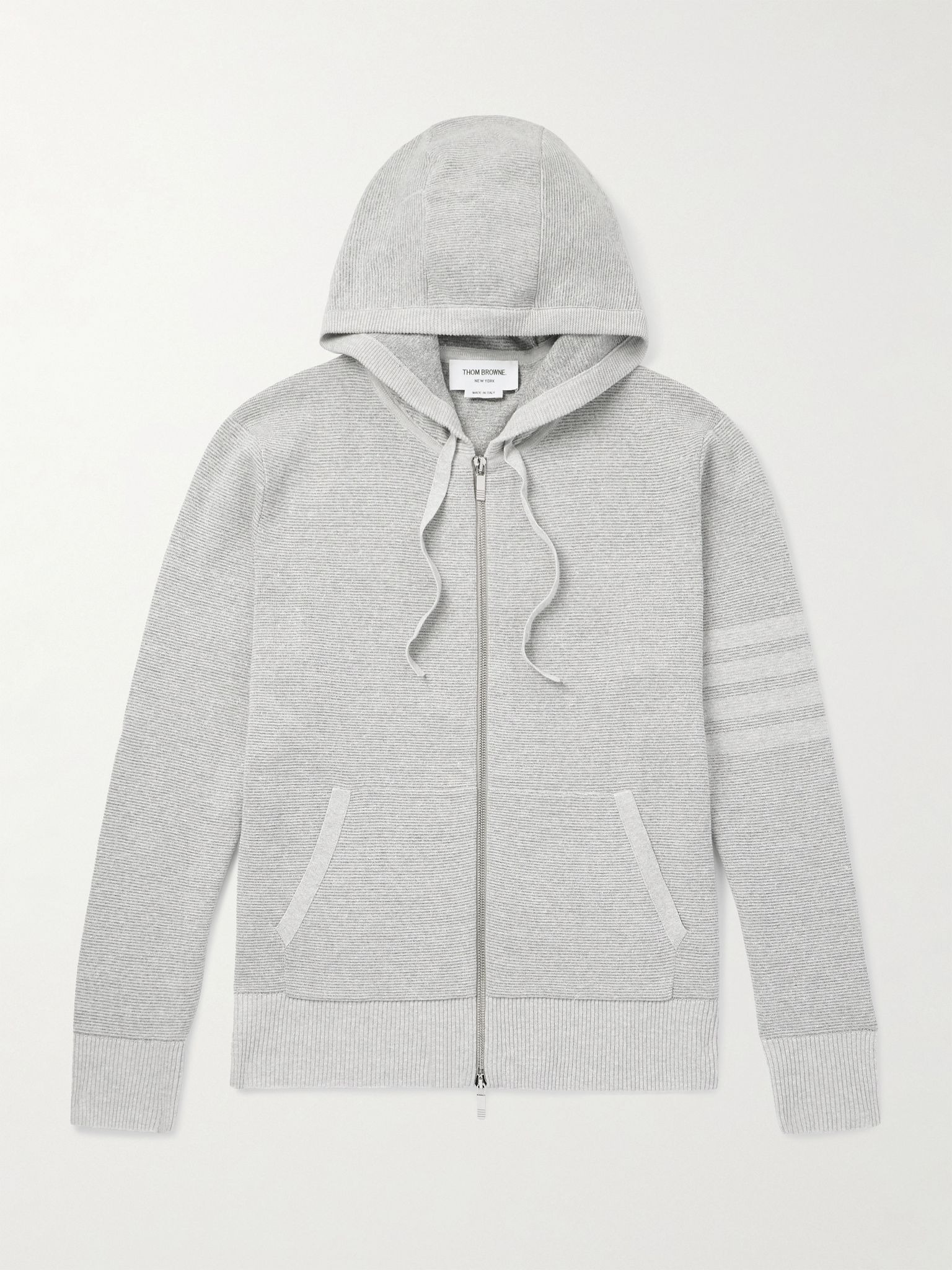 Thom Browne's zip-up hoodie will fit seamlessly into your everyday wardrobe. It's knitted from a breathable cotton-blend and detailed with the brand's signature '4-Bar Stripe' at the sleeve. Size & Fit - Size 0 = XS, 1 = S, 2 = M, 3 = L, 4 = XL, 5 = XXL and 6 = XXXL - Fits true to size. Take your normal size - Designed for a slim fit - Fine knit - Model is shown wearing a 2 - Model measures: chest 38"/ 96cm, height 6'0"/ 183cm Details & Care - Tonal-grey melange linen and cotton-blend - Two-way zip fastening - 68% linen, 32% cotton - Dry clean
