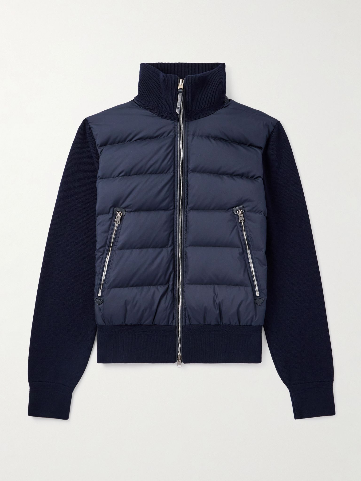 TOM FORD's jacket combines luxury materials with strategic construction. Reinforced with leather trims along the placket and stand collar, it's been knitted in Italy from naturally insulating wool and has a shell front panel that's quilted to keep the down fill evenly distributed. Size & Fit - Fits true to size, however those who are between sizes should take the larger size - Designed for a regular fit - Quilted, non-stretchy fabric with knit panels - Model is shown wearing an IT 48 - Model measures: chest 38"/ 96cm, height 6'1"/ 185cm Details & Care - Navy shell, wool and leather - Two-way zip fastening - 100% polyester; trim1: 100% wool; trim2: 100% leather (Lamb); filling: 90% down, 10% feathers (Goose); lining: 100% polyester - Partially lined - Dry clean