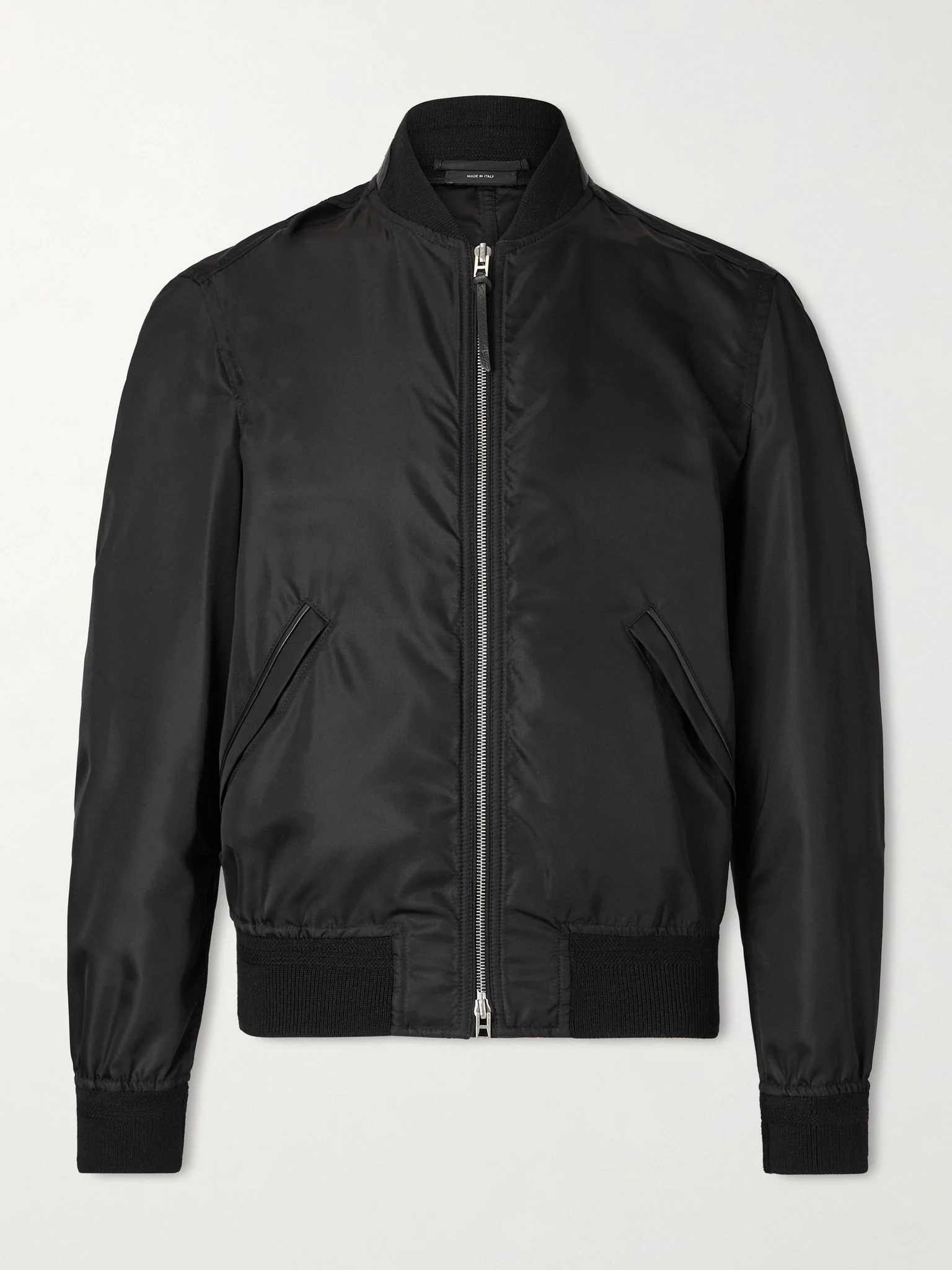 TOM FORD's bomber jacket is as sleek as it is functional. It's cut from technical silk, which has been treated for weather resistance, while the wool ribbed trims are excellent at locking in heat. Size & Fit - Fits true to size. Take your normal size - Designed for a regular fit - Ribbed hem - Lightweight, non-stretchy fabric - Model is shown wearing an IT 50 - Model measures: chest 37"/95cm, height 6'2"/ 188cm Details & Care - Material: 100% silk - Trim: 92% virgin wool, 7% polyamide, 1% elastane - Closure: zipped front - Care instructions: dry clean - Made in Italy - Colour: black