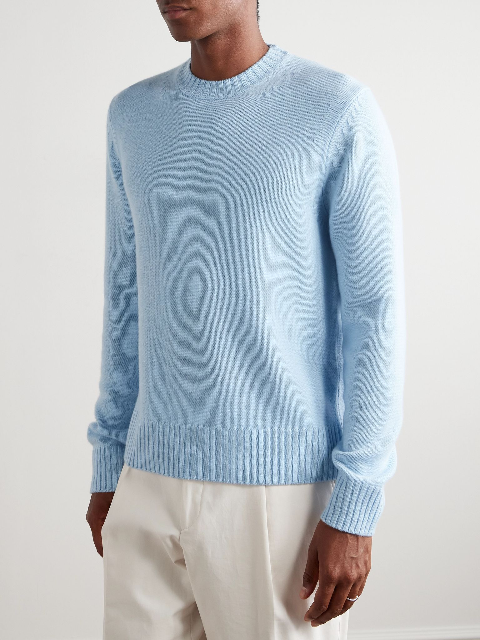 TOM FORD's sweater has been knitted in Italy from soft, naturally insulating cashmere. With the right care - storing it folded and gently using a comb to remove pilling - it'll last a lifetime. Size & Fit - Fits true to size. Take your normal size - Designed for a slim fit - Mid-weight knit - Model is shown wearing an IT 48 - Model measures: chest 38"/ 96cm, height 6'1"/ 185cm Details & Care - Light-blue cashmere - 100% cashmere - Dry clean