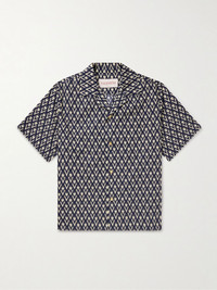Valentino Garavani's shirt features an all-over logo print that creates a striking geometric pattern from afar. It's been made in Italy from cotton-poplin and has a relaxed camp collar and gilded logo-embossed buttons. Size & Fit - Fits true to size. Take your normal size - Designed for a boxy fit - Mid-weight, non-stretchy fabric - Model is shown wearing an IT 48 - Model measures: chest 38"/ 96cm, height 6'2"/ 188cm Details & Care - Navy and beige cotton-poplin - Button fastenings - 100% cotton - Dry clean