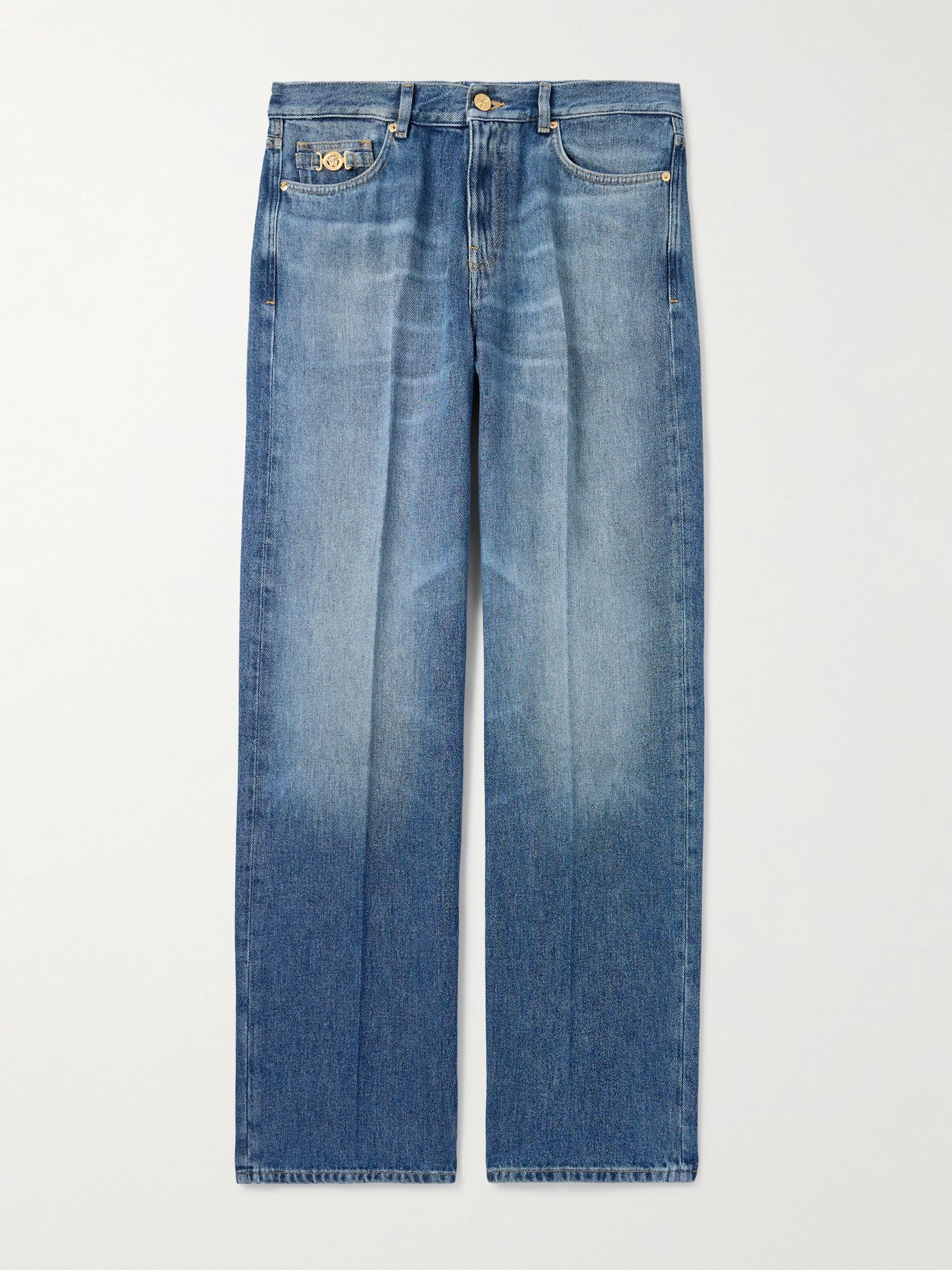 Versace's jeans are detailed with the house's 'Medusa' charm on the coin pocket. Made from Lyocell-denim, they're heavily faded through the thighs and pressed with sharp creases along the legs. Style yours with a printed shirt and loafers. Size & Fit - Fits true to size. Take your normal size - Regular-straight leg, mid-rise style - Mid-weight, non-stretchy fabric - Model is shown wearing a 32 - Model measures: waist size 32, height 6'1"/ 188cm Details & Care - Blue denim - Button and zip fastening - 100% Lyocell; trim: 100% leather (Calf) - Machine wash
