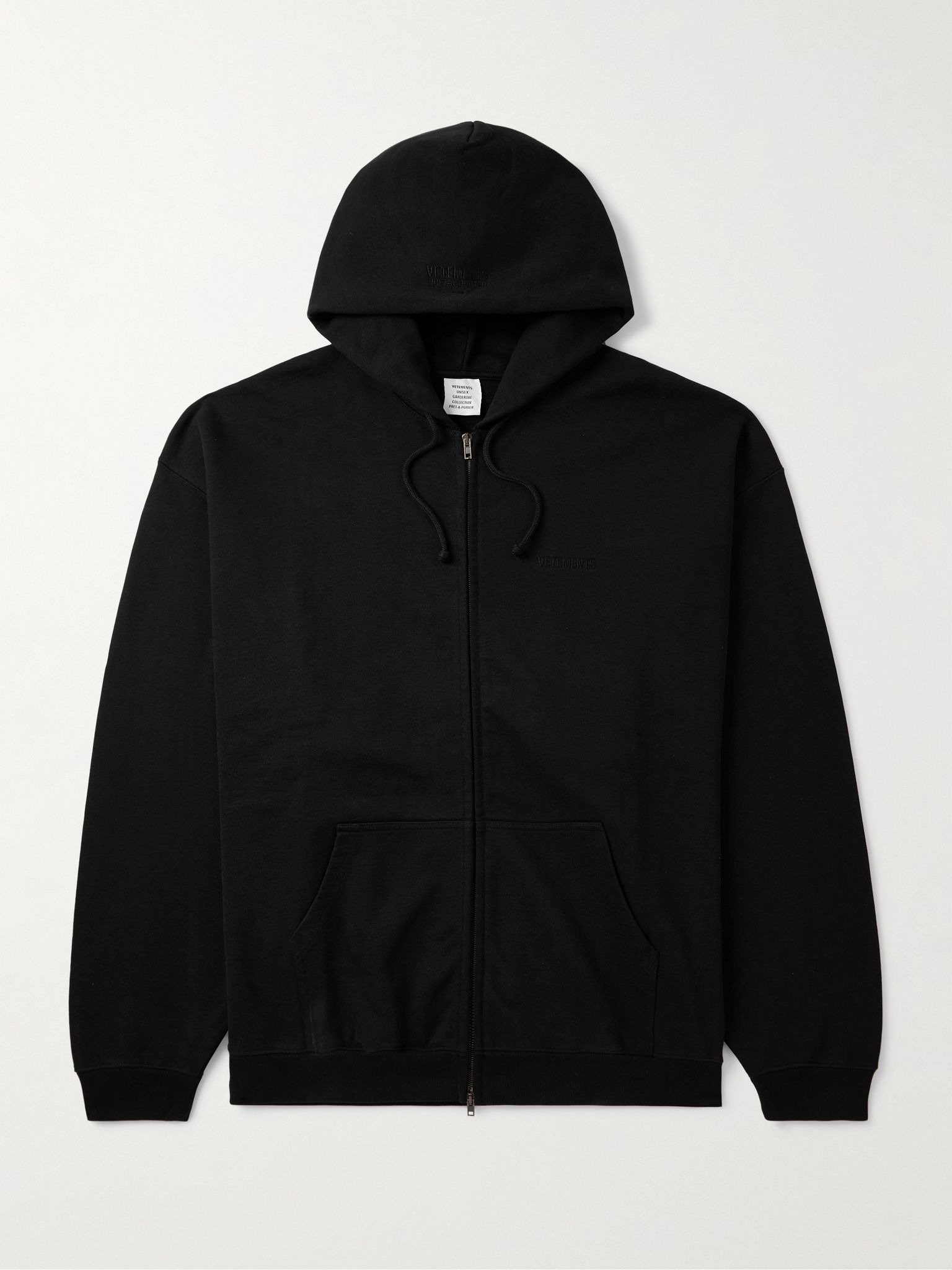 Oversized hoodies have been a calling card of Vetements' collections since it launched in 2014. This zip-up version is made from soft cotton-blend jersey and has dropped shoulder seams to enhance the relaxed fit. Look closely and you'll spot a tonal logo embroidered at the chest. Size & Fit - Model wears a size larger to achieve a looser fit - Mid-weight, slightly stretchy fabric - Model is shown wearing a M - Model measures: chest 36"/ 92cm, height 6'2"/ 188cm Details & Care - Black cotton-blend jersey - Two-way zip fastening - 80% cotton, 20% polyester - Machine wash