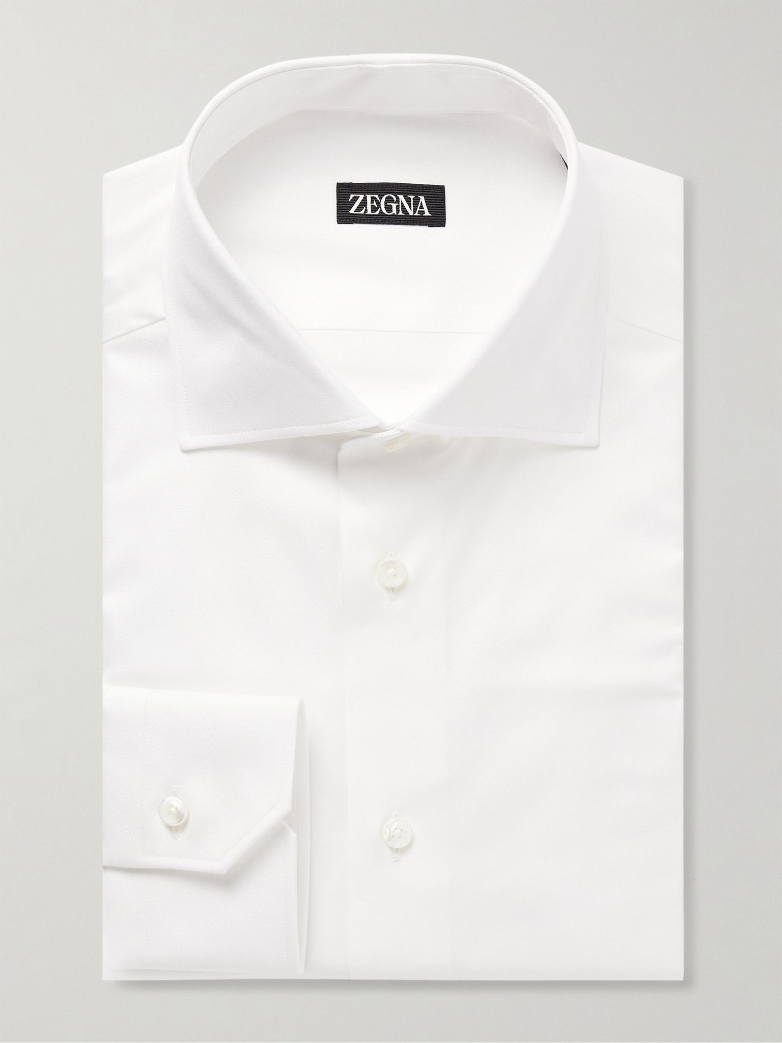 Perfect for formal occasions, ZEGNA's shirt is tailored with a cutaway collar to neatly frame a larger tie knot. It's cut from smooth cotton-twill and has angled cuffs. Size & Fit - Fits true to size. Take your normal size - Those with broad shoulders may wish to take the next size up - Tailored for a regular fit - Lightweight, non-stretchy fabric - Model is shown wearing an EU 39 (UK/US 15.5) - Model measures: chest 38"/ 96cm, height 6'1"/ 185cm Details & Care - White cotton-twill - Button fastenings - 100% cotton - Machine wash - Mother-of-pearl: Australia