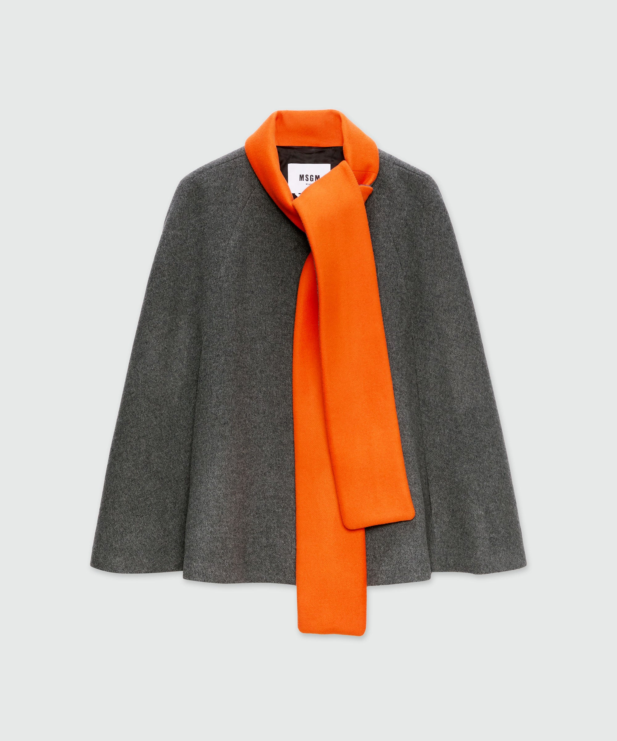 Wool cloth cape with a contrasting colorblock shawl collar. Clean lines with side slits for arm passage, a straight hem, and an MSGM logo detail on the back. Oversized fit. Model wears size S/40. CODE: 3941MDC11Y-257604-98 Details and fit - 70% WO / 30% PA