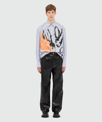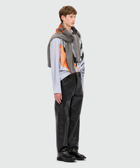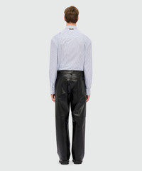 Structured faux leather trousers. Horizontal knee seams, five-pocket styling with belt loops. Concealed zip and metal button closure. MSGM logo patch on the back. Oversized fit. The model is wearing size M/48. CODE: 3940MP08-257509-99 Details and fit - 51% PL / 49% PU