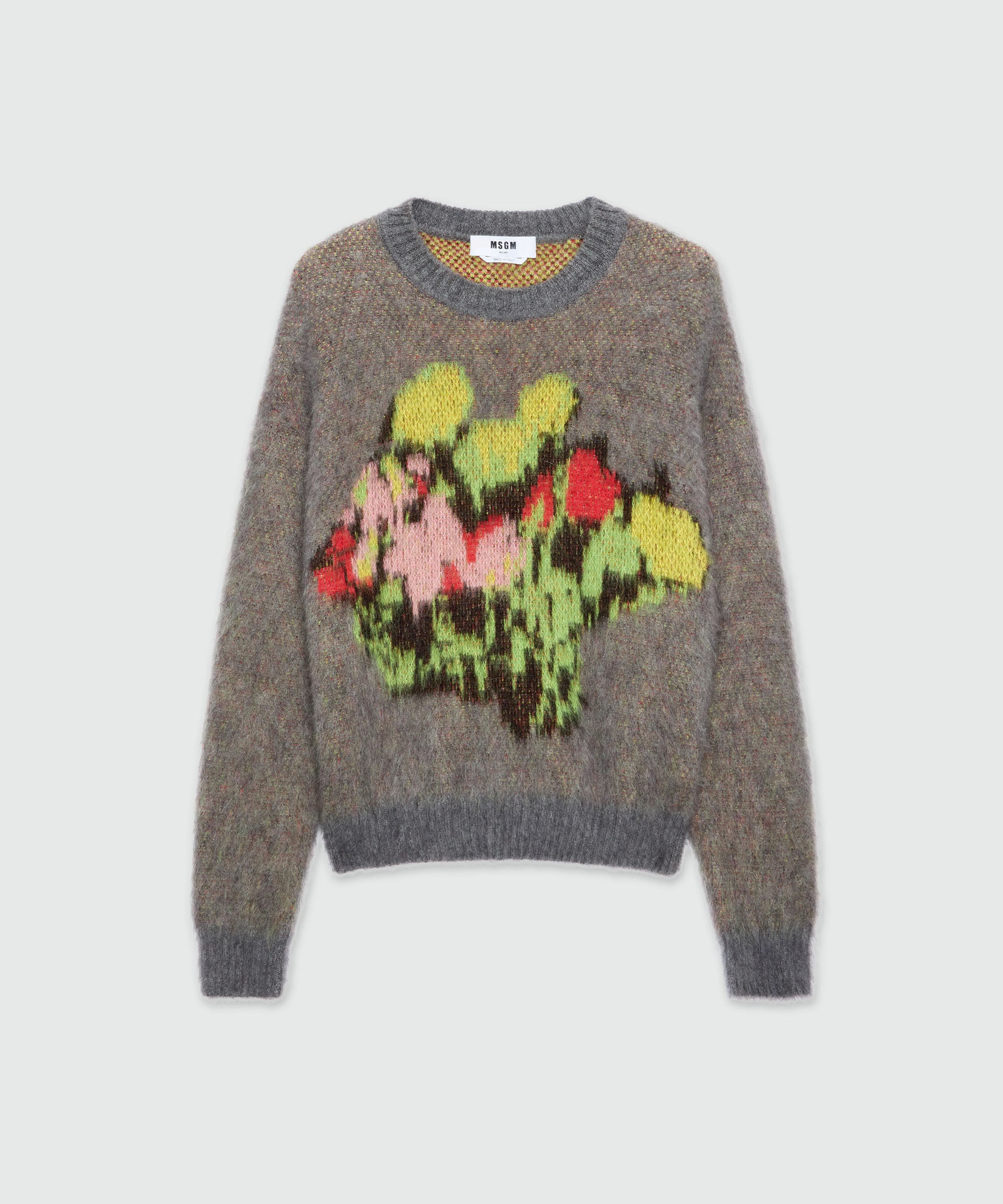 Long-sleeved sweater made of brushed wool blend yarn. Crew neck, ribbed cuffs and hem, and large Rose Bouquet graphic inlaid on the front. MSGM label on the back. Oversized fit. The model wears size S/40. CODE: 3942MDM196-257977-98 Details and fit - 38% PC1 / 32% PA / 3