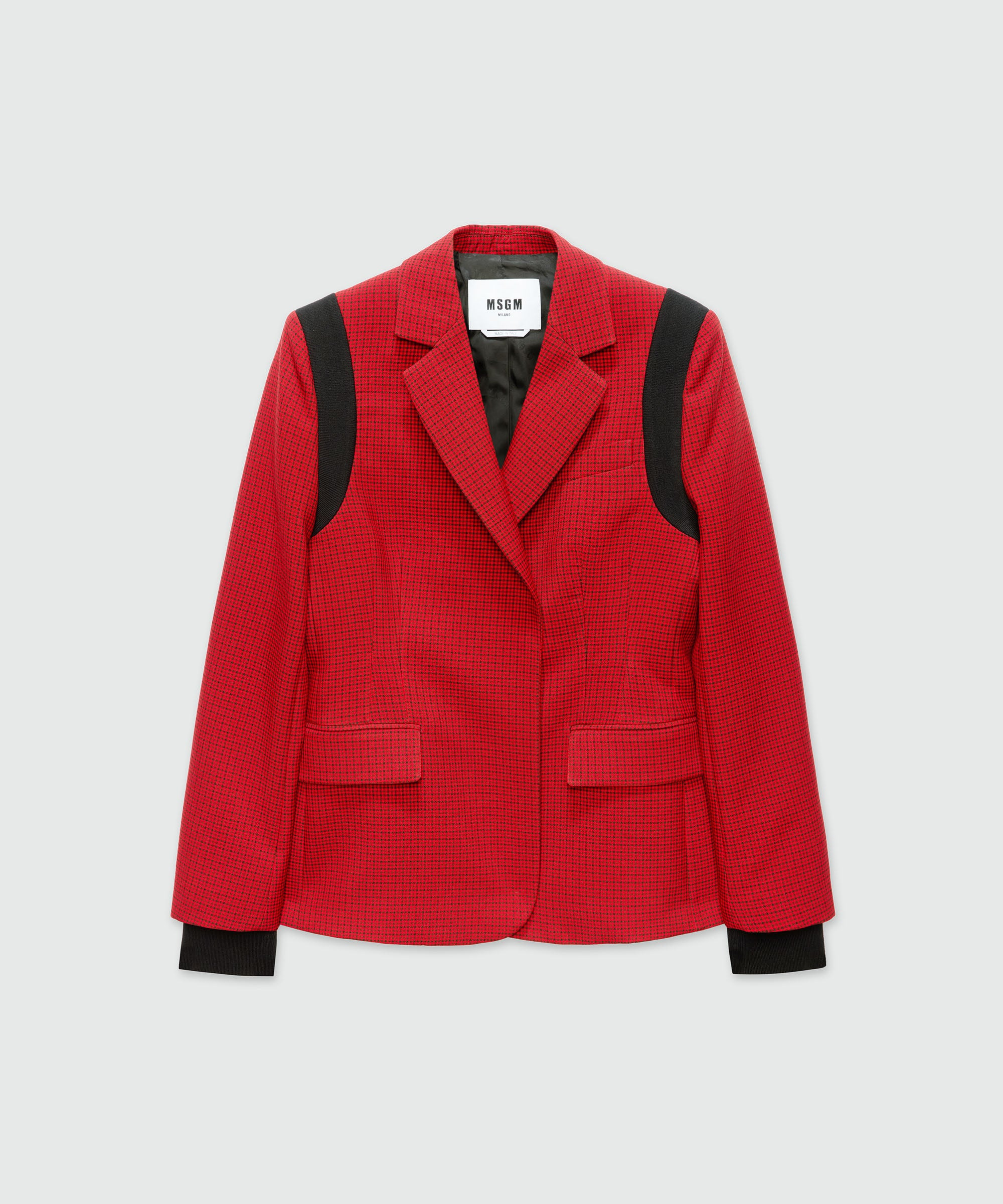 Red single-breasted jacket with check pattern