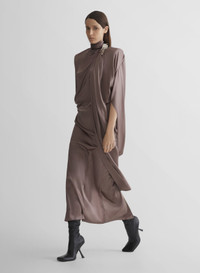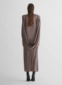 - Draped scarf collar sheath dress in light silk satin - Statement padded shoulders - Three-quarter sleeves - Invisible zipper - Mid-calf length - Draped cape on the back - Model is 180 cm / 5'11" and is wearing a size 36 DETAILS MAIN FABRIC:74% ACETATE 23% POLYAMIDE 3% ELASTANE made in PORTUGAL style: 26P1RO18133003