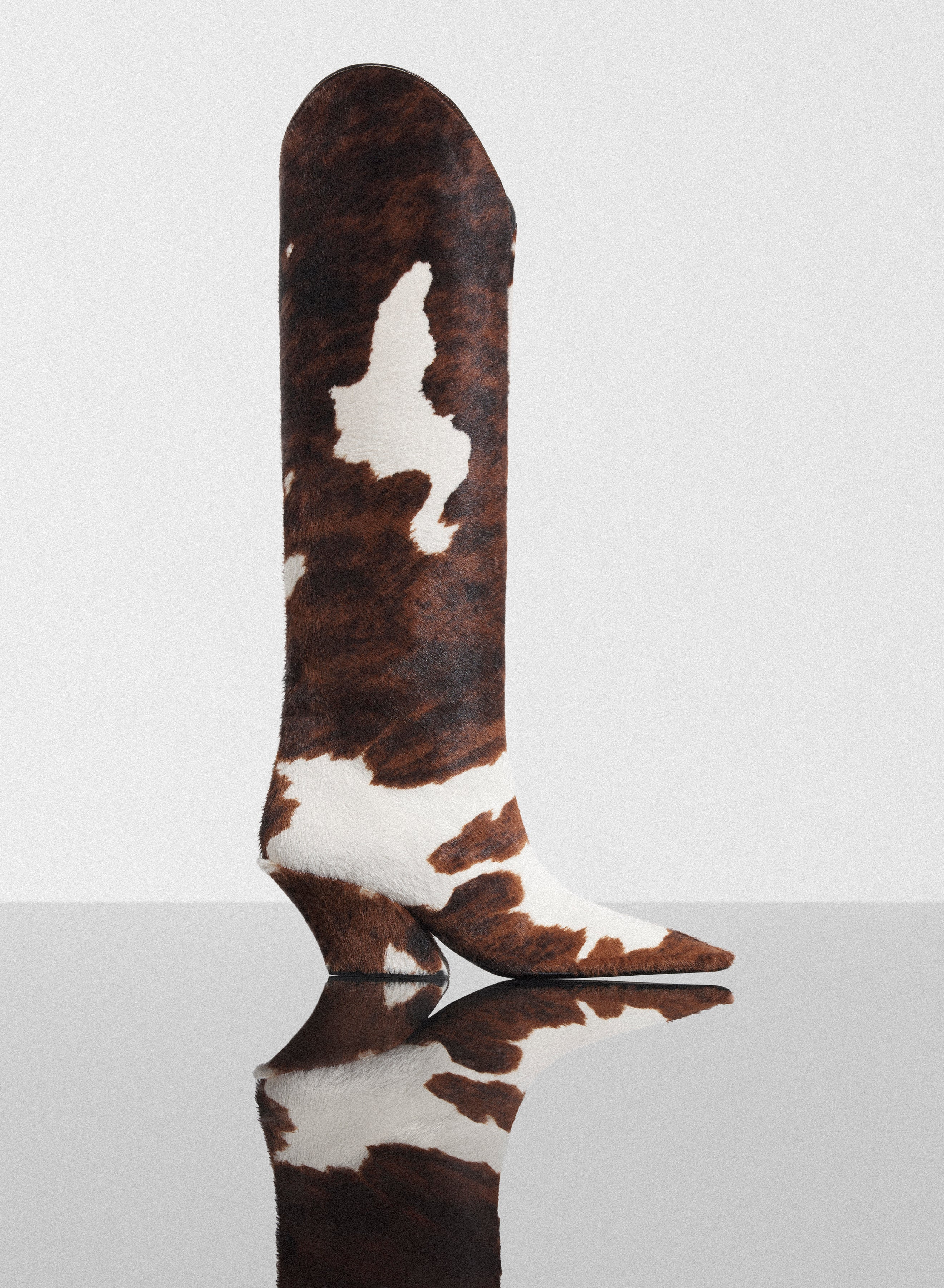- Italian craftmanship - Knee-high boots in cowprint faux ponyhair - Pointed square toe - Leather lining and outsole - Logo embossed on the insole - 65mm slanted cowboy heel DETAILS UPPER : 100% Calfskin, Bos Taurus, New Zealand, Farmed LINING: 100% GoatSkin, Capra Hircus, India, Farmed SOLE: 80% Calfskin, Bos Taurus, Italy, Farmed, 20% TPU made in Italy style: 25F10CH00499033