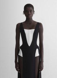 - From the Jeu de Paume couture collection spring/summer 1998 - Long fitted black dress in stretch crepe - Plunging v-neckline - Contrast corseted white bodysuit under-layer - Ultra-long side slits - Lacing and an invisible zipper in the back DETAILS LINING:100% CUPRO MAIN FABRIC:83% POLYAMIDE 17% ELASTANE SECOND FABRIC:96% VISCOSE 4% ELASTANE made in BULGARIA style: COM1RO1797470