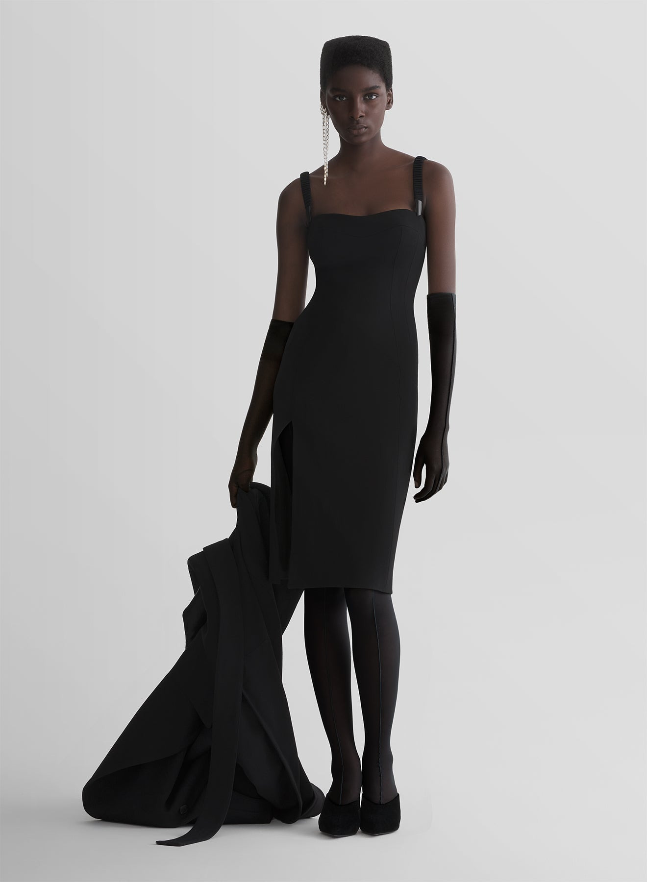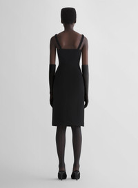 - From the Lingerie pret-a-porter collection fall/winter 1998-1999 - Fitted dress in black fluid heavy wool - Square neckline with gathered adjustable straps - Triangular buckles - Long side slit - Invisible zipper in the back - Below the knee-length hem DETAILS LINING:100% CUPRO MAIN FABRIC:100% SILK SECOND FABRIC:78% VISCOSE 22% WOOL made in BULGARIA style: COM1RO1798196