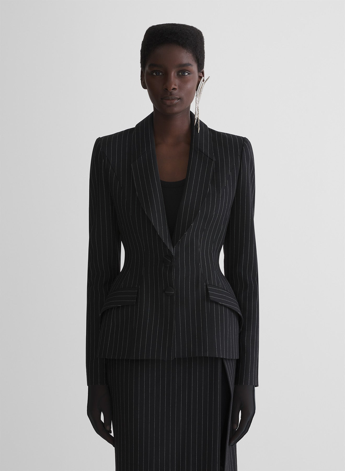 - From the Lingerie pret-a-porter collection fall/winter 1998-1999 - Fitted blazer in pinstripe wool - Notched lapel and straight padded shoulders - Fabric-covered buttons - Hourglass waist - Angular flap pockets - Fully lined DETAILS LINING:100% CUPRO MAIN FABRIC:98% WOOL 2% POLYESTER made in UKRAINE style: COM1VE04761001