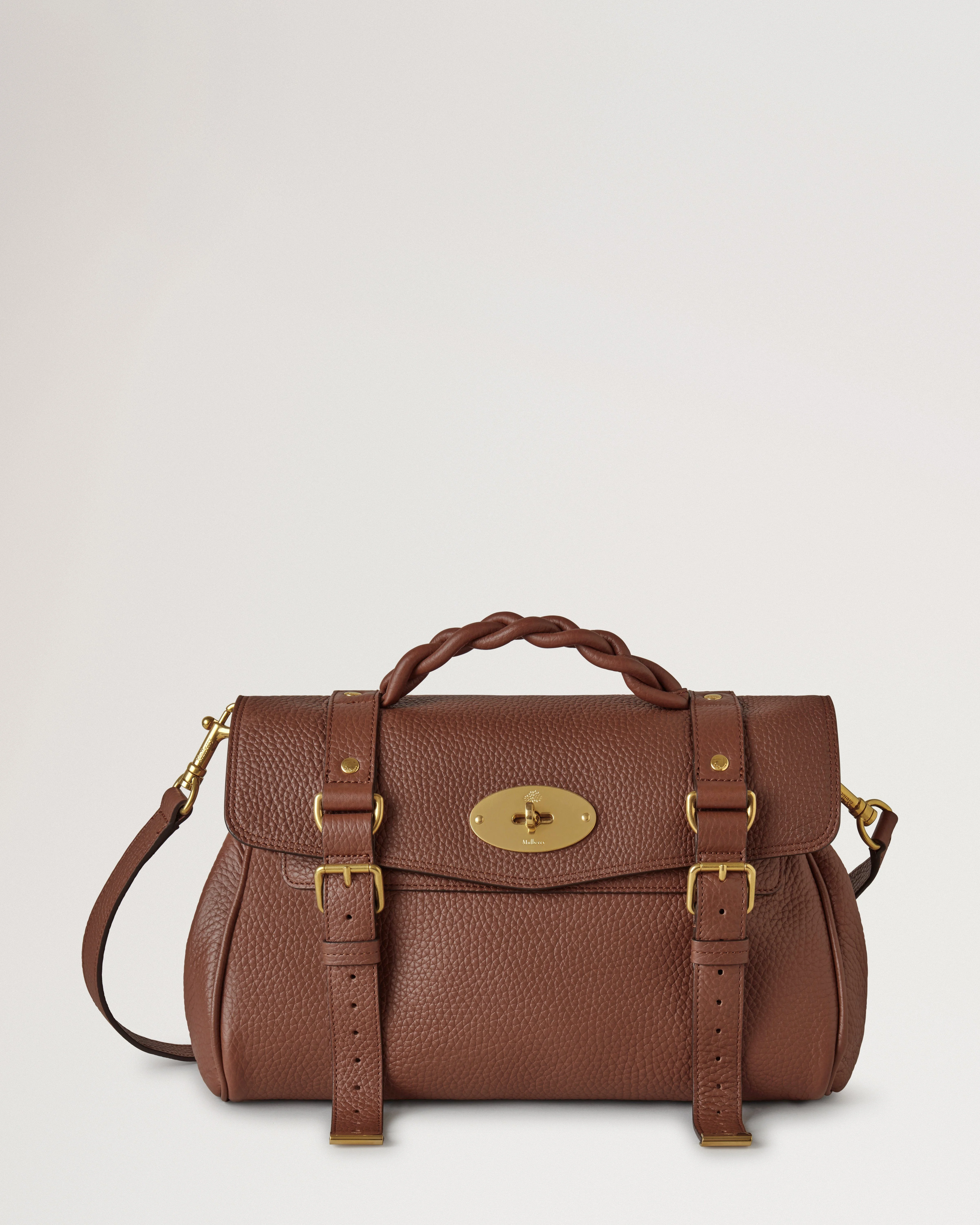 The Alexa effortlessly combines elements from two iconic Mulberry styles: the Bayswater bag and the Elkington briefcase. The result is an understatedly cool satchel complete with the signature Mulberry Postman’s Lock and belt buckle and strap hardware. Carry by the plaited leather top handle or wear with the adjustable cross body strap. Details A cult bag that epitomises laidback luxury. - Brass hardware finish - Postman’s Lock closure - Handcrafted braided top handle - Adjustable leather shoulder strap for crossbody wear - One main compartment - Internal slip pocket Height 9" Width 13" Depth 6¾" Handle Drop 2" Shoulder Strap 38¼-44½" Weight ½kg, approximately Material Heavy Grain A soft heavy bovine leather with a beautiful soft and supple hand feel. The surface will gradually become even softer with use adding to the beauty of the leather. This product's code is HH6746-736G222