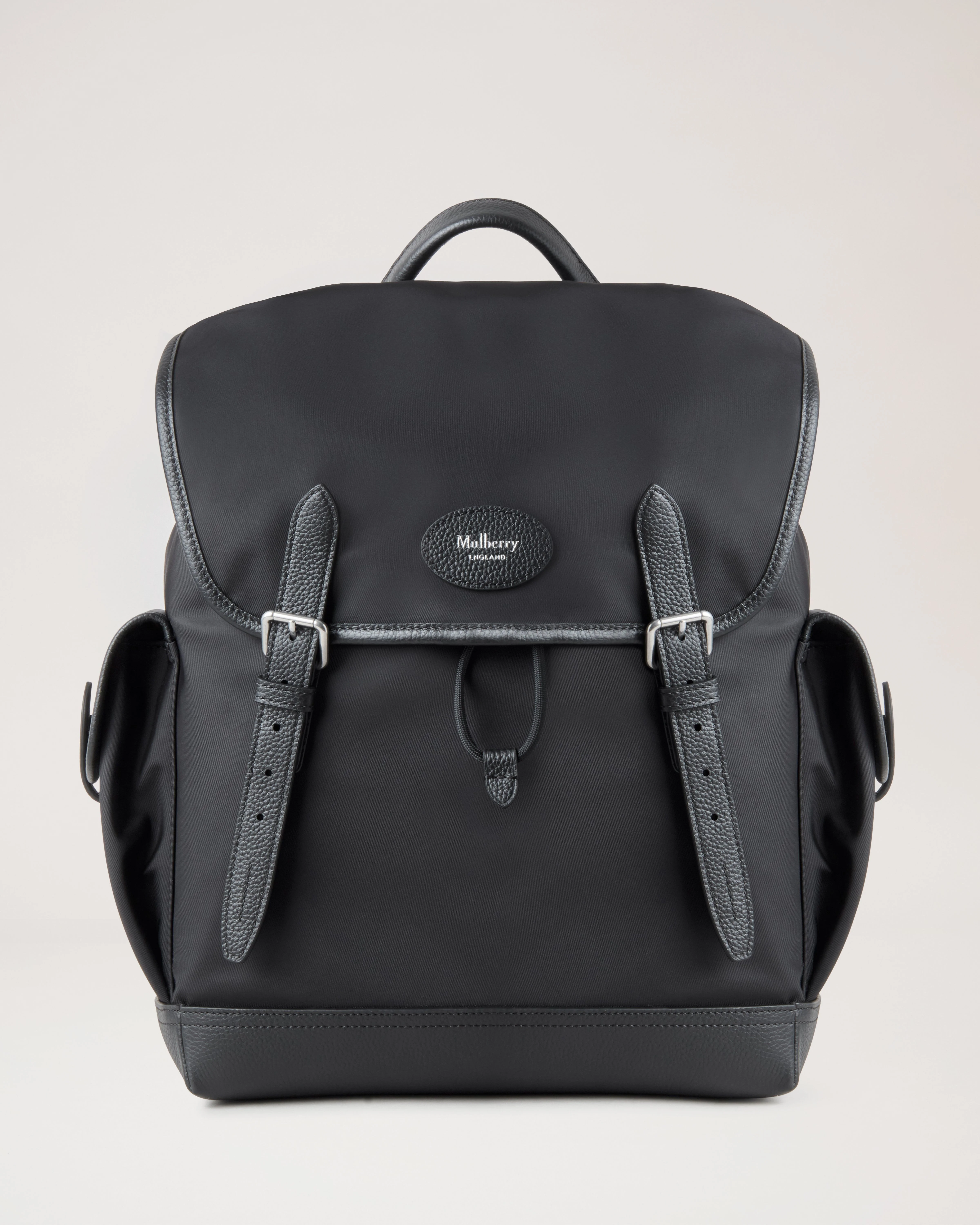 The Heritage collection was designed in tribute to the early bags of Mulberry, which were inspired by English country pursuits. The Heritage Backpack in durable nylon features practical pockets, belt and buckle strap detailing and a signature logo plaque. The straps can be adjusted for a personal fit. Details This bag features practical pockets, belt and buckle strap detailing. - Practical side pockets - Belt and buckle strap detailing - One internal zipped pocket - Foil embossed with Mulberry signature - Adjustable shoulder straps in padded webbing - Dual popper closure for convenient opening, with option of functional buckles - Mulberry branded leather strap on front. - One main compartment with a nylon drawstring closure under the flap - Two external side pockets with a flap and popper closure - Black Mulberry Tree lining - Trimmed with grained leather detailing - Smooth Recycled Nylon fabrication Height 15¾" Width 11¾" Depth 6" Weight ¼kg, approximately Material Nylon A durable, woven, recycled nylon with a bovine leather trim. This product's code is HS5202-179A100