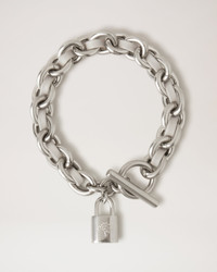 Inspired by the woven leather and chain strap of our iconic Lily evening bag, this statement bracelet also showcases our iconic Postman's Lock hardware. Details A woven leather and chain bracelet. - Braided with supple Nappa leather - Mulberry branded padlock charm inspired by Lily padlock - T-bar toggle clasp closure - Available in 2 sizes (S and M) - Wear with care for longevity - Avoid contact with water and perfume - Comes in a Mulberry branded box and pouch - Made in Italy Length 7¾" Width ½" Material Silky Calf & Silver Plated Stainless Steel 90% Bovine, 10% Stainless Steel This product's code is QB2395-000C919