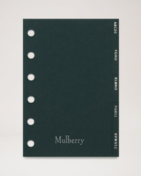 The classic, elegant stationery collection is made from the highest quality paper stock, designed and produced in England. These dividers are understated and slim, to help organise your stationery and contacts. This paper insert fits our Pocket Book size Mulberry organiser. Details This paper insert fits our Pocket Book size Mulberry organiser. - Five dividers - Alphabetically labelled - All our stationary items are FSC® certified Height 4¾" Width 3" Material Paper The Mulberry approach is to make a positive difference to its people, environment and communities we work in. All our paper is sourced from responsible sources. This product's code is NZ7336-000Q633