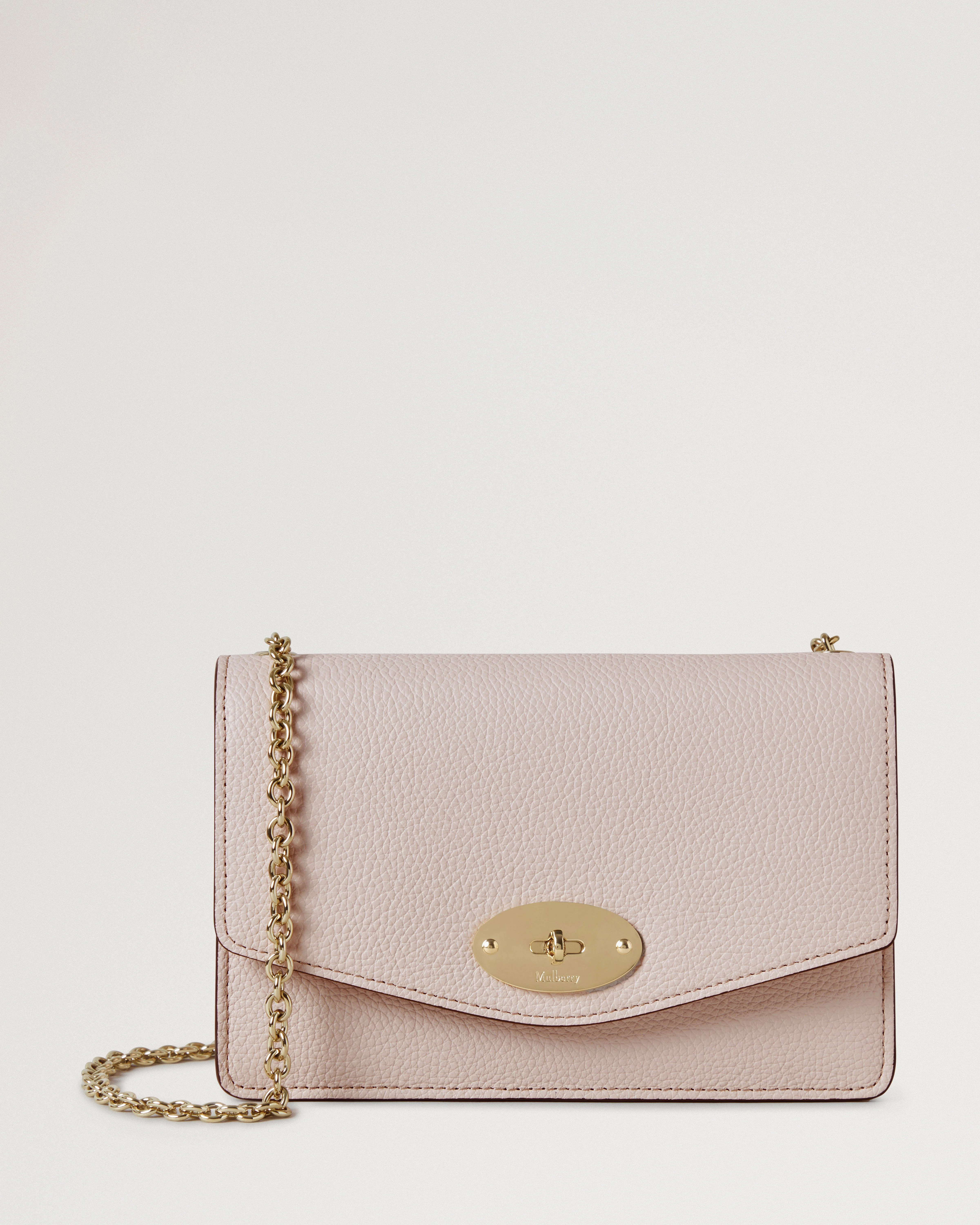 The Small Darley is a classic bag that celebrates our iconic Postman’s Lock. It’s perfect for carrying essentials or keeping valuables secure inside a large tote. Its elegant envelope silhouette can even be transformed into a clutch due to its detachable chain strap. Details The Small Darley can be worn across the body, over the shoulder, or carried as a clutch. - Detachable chain strap - Postman's Lock closure - One main compartment - Eight credit card slip pockets - One internal zip compartment - Two internal slip pockets - One external zip pocket with gusset - Soft Gold component finish - Nappa and moire lining Height 5" Width 7½" Depth 1¾" Shoulder Strap Length 22" Weight ¼kg, approximately Material Small Classic Grain A soft cow leather with a small printed grain effect. The leather is lightly finished to protect the grain surface. This product's code is RL7791-205J002